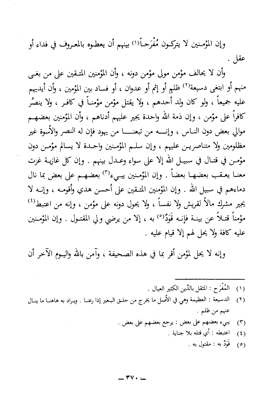 وأن لا يحالف مؤمن مولى مؤمن دونه، وأن المؤمنين المتقين على من بغى منهم أو ابتغى دسيعة (¬2) ظلم أو إثم أو عدوان، أو فساد بين المؤمنين، وأن أيديهم عليه جميعا، ولو كان ولد أحدهم، ولا يقتل مؤمن مؤمنا في كافر، ولا ينصر كافرا على مؤمن، وإن ذمة الله واحدة يجير عليهم أدناهم، وأن المؤمنين بعضهم موالي بعض دون الناس، وإنه من تبعنا من يهود فإن له النصر والأسوة غير مظلومين ولا متناصرين عليهم، وإن سلم المؤمنين واحدة لا يسالم مؤمن دون مؤمن في قتال في سبيل الله إلا على سواء وعدل بينهم. وإن كل غاية غزت معنا يعقب بعضها بعضا. وإن المؤمنين يبيء (¬3) بعضهم على بعض بما نال دماءهم في سبيل الله. وإن المؤمنين المتقين على أحسن هدي وأقومه، وإنه لا يجير مشرك مالا لقريش ولا نفسا، ولا يحول دونه على مؤمن، وإنه من اعتبط (¬4) مؤمنا قتلا عن بينة فإنه قود (¬5) به، إلا من يرضي ولي المقتول. وإن المؤمنين عليه كافة ولا يحل لهم إلا قيام عليه.