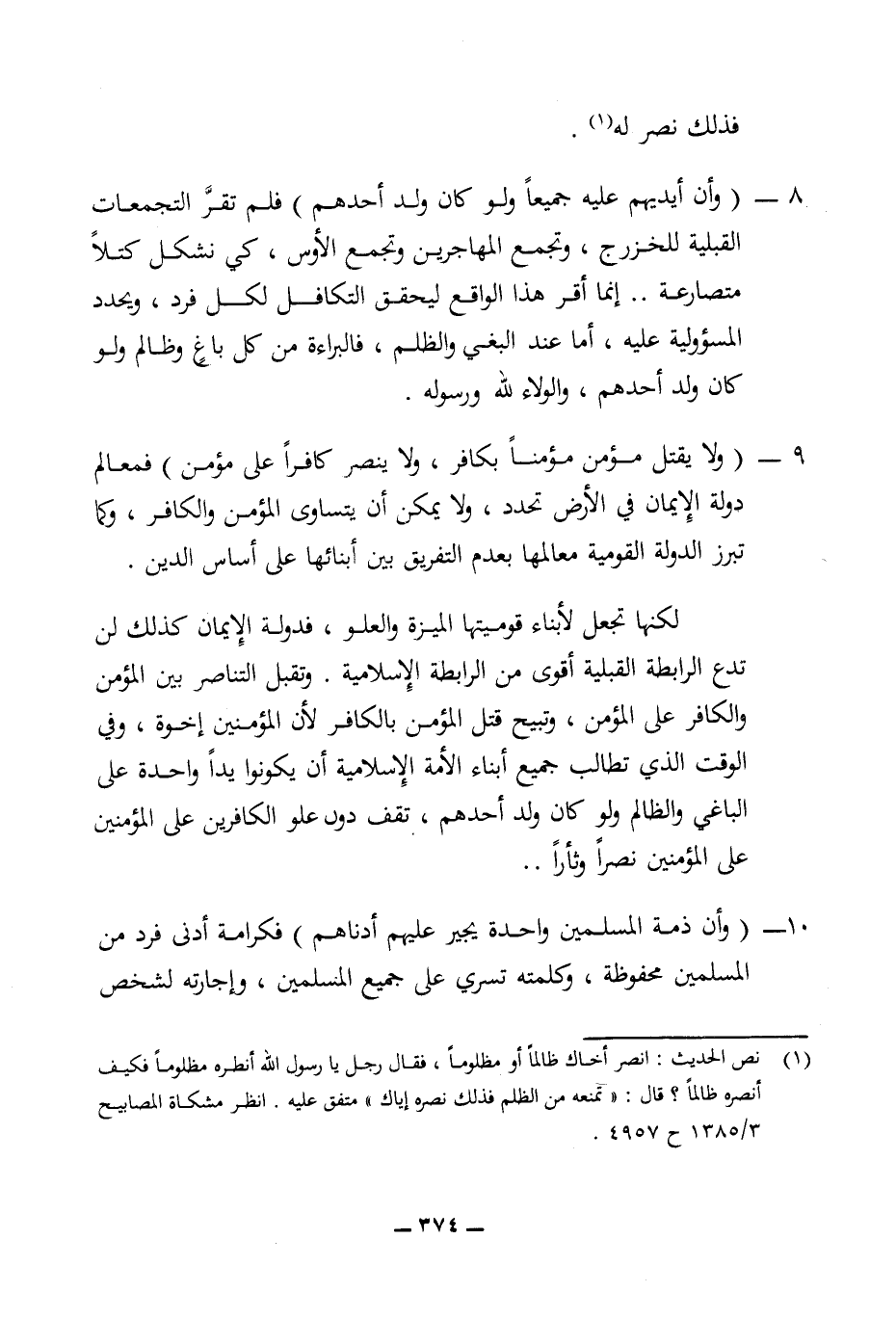 9 - (ولا يقتل مؤمن مؤمنا بكافر، ولا ينصر كافرا على مؤمن) فمعالم دولة الإيمان في الأرض تحدد، ولا يمكن أن يتساوى المؤمن والكافر، وكما تبرز الدولة القومية معالمها بعدم التفريق بين أبنائها على أساس الدين.