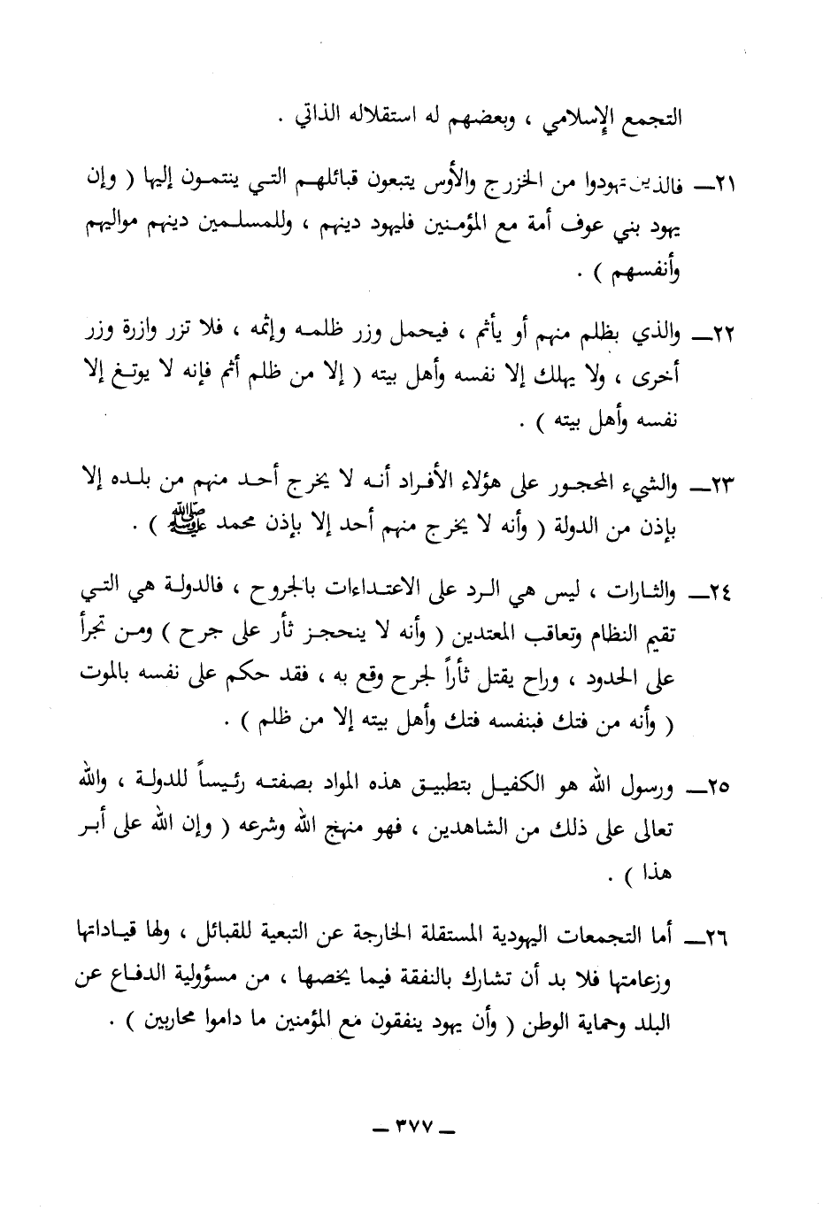 26 - أما التجمعات اليهودية المستقلة الخارجة عن التبعية للقبائل، ولها قياداتها وزعامتها فلا بد أن تشارك بالنفقة فيما يخصها، من مسؤولية الدفاع من البلد وحاية الوطن (وأن يهود ينفقون مع المؤمنين ما داموا محاربين).