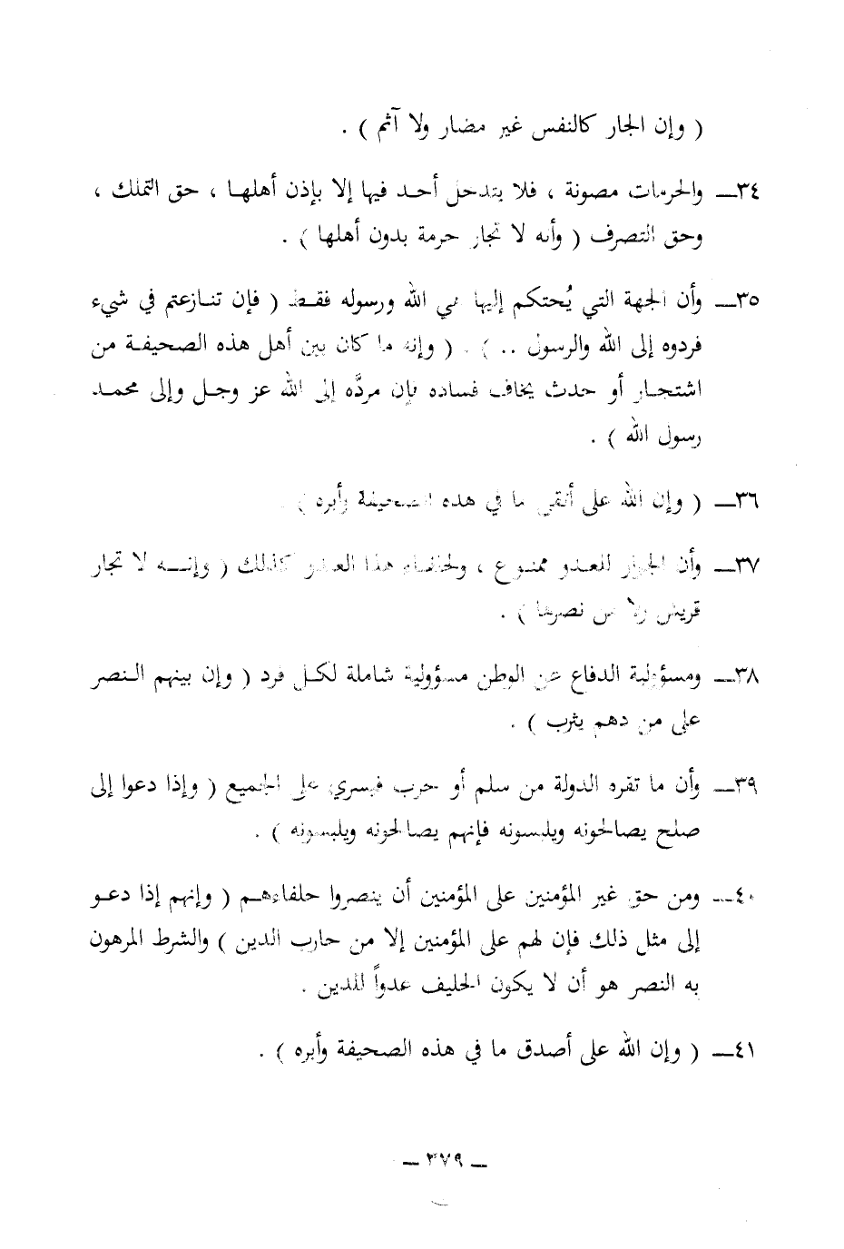 40 - ومن حق غير المؤمنين على المؤمنين أن ينصروا حلفاءهم (وإنهم إذا دعو إلى مثل ذلك فإن لهم على المؤمنين إلا من حارب الدين) والشرط المرهون به النصر هو أن لا يكون الحليف عدوا للدين.