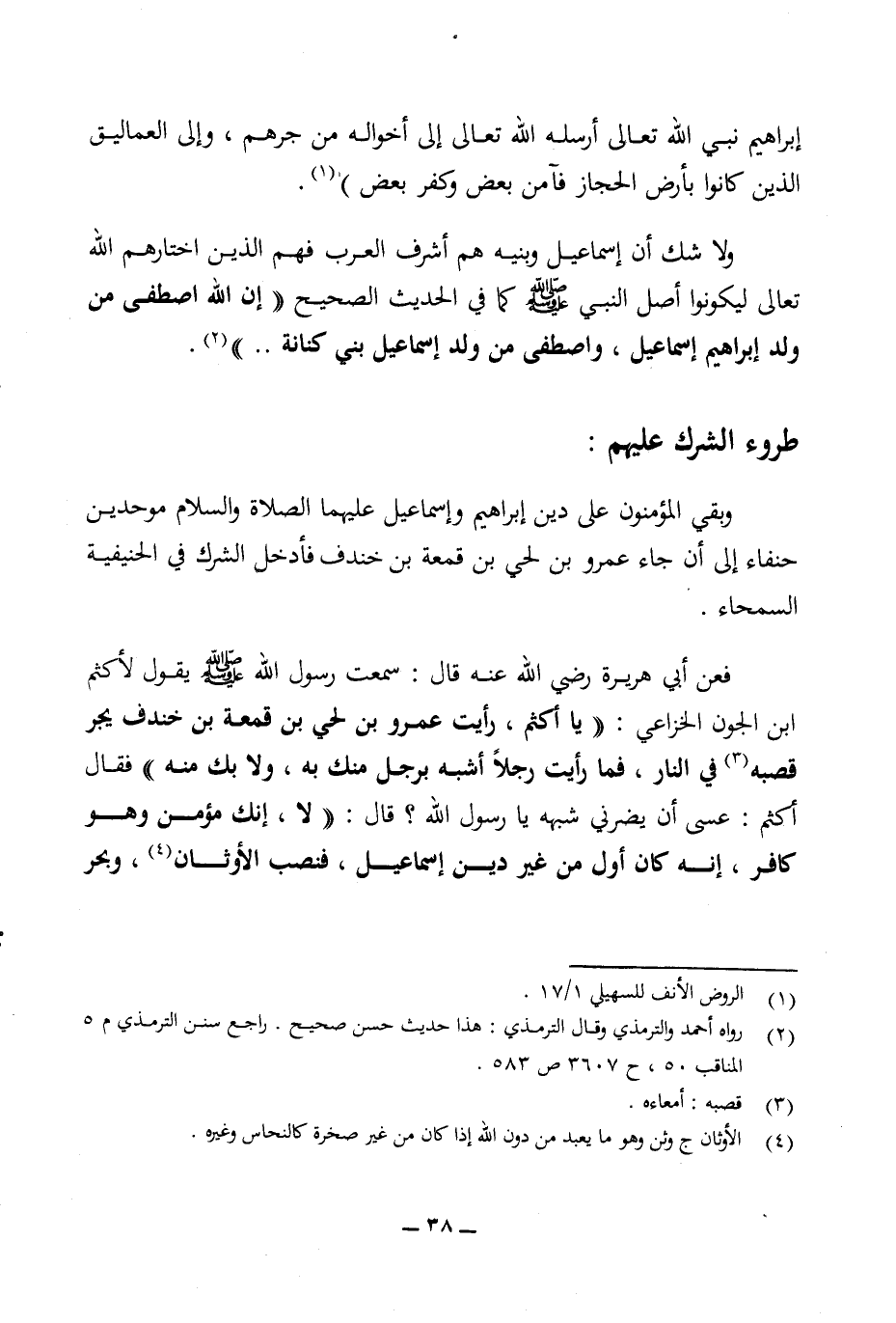 وبقي المؤمنون على دين إبراهيم وإسماعيل عليهما الصلاة والسلام موحدين حنفاء إلى أن جاء عمرو بن لحي بن قمعة بن خندف فأدخل الشرك في الحنيفية السمحاء.