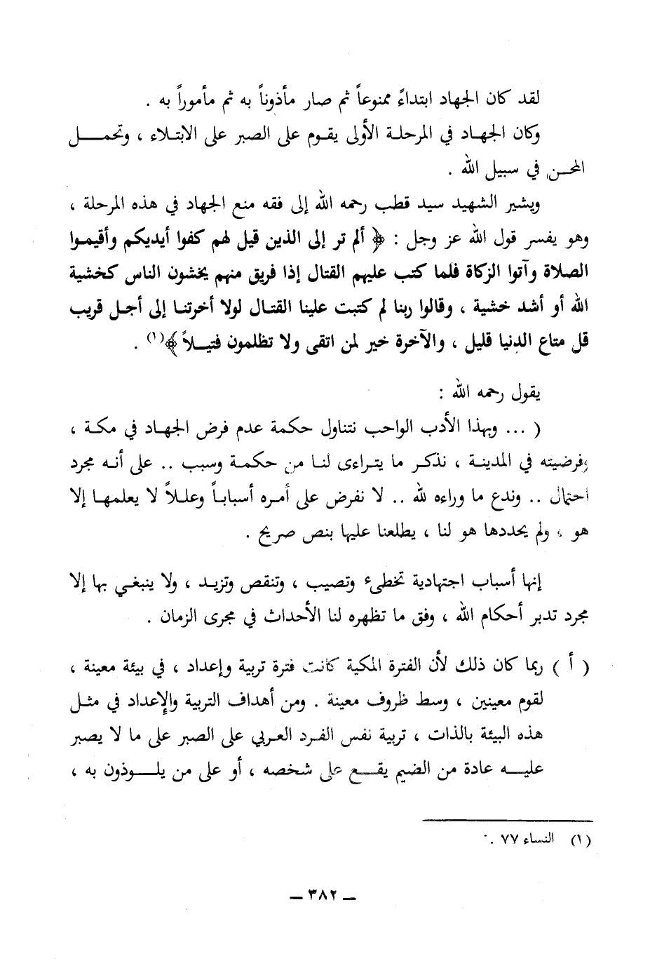 ويشير الشهيد سيد قطب رحمه الله إلى فقه منع الجهاد في هذه المرحلة، وهو يفسر قول الله عز وجل: {ألم تر إلى الذين قيل لهم كفوا أيدكم وأقيموا الصلاة وآتوا الزكاة فلما كتب عليهم القتال إذا فريق منهم يخشون الناس كخشية الله أو أشد خشية وقالوا ربنا لم كتبت علينا القتال لولا أخرتنا إلى أجل قريب قل متاع الدنيا قليل والآخرة خير لمن اتقى ولا تظلمون فتيلا} (¬1). يقول الله: