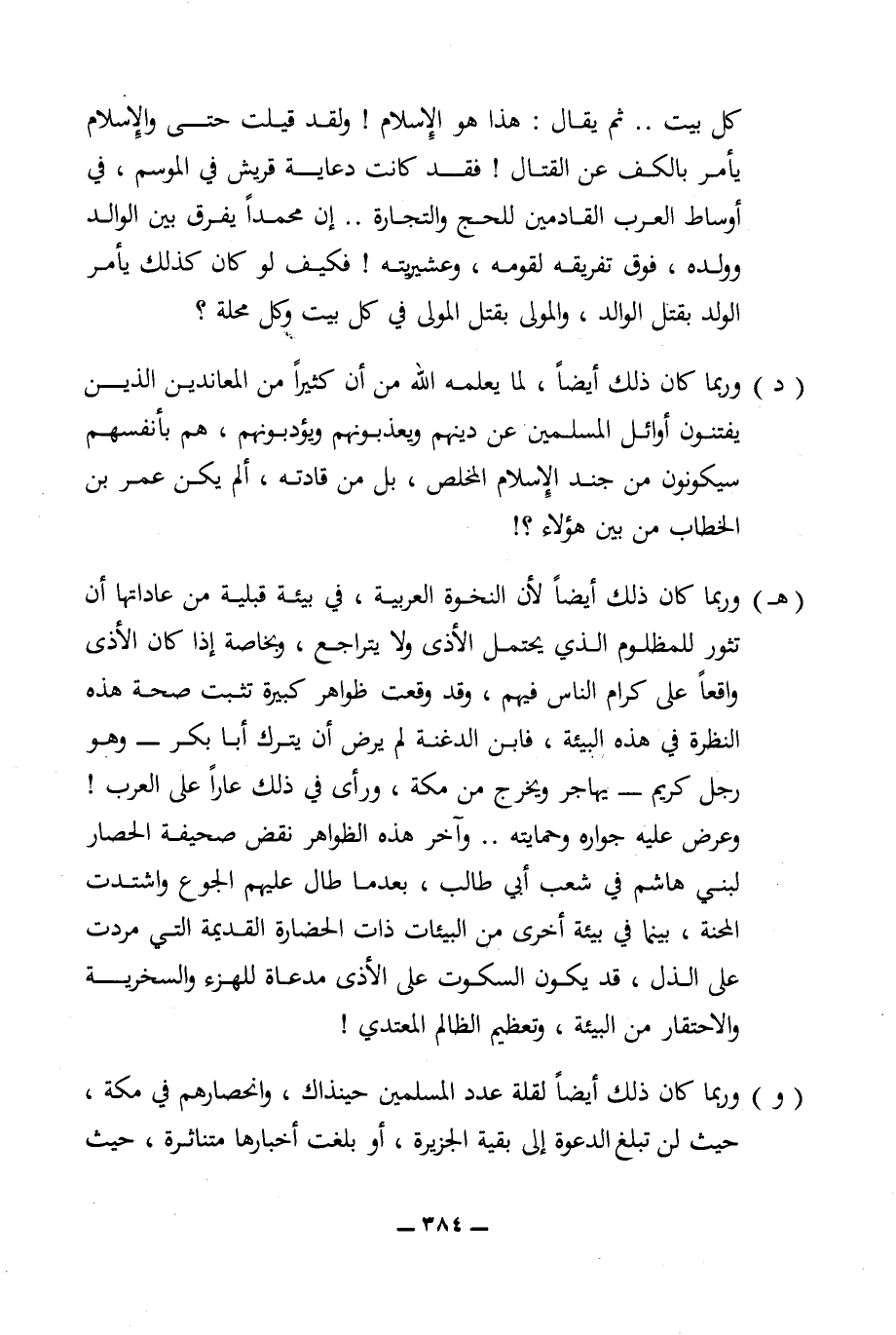 (هـ) وربما كان ذلك أيضا لأن النخوة العربية، في بيئة قبلية من عاداتها أن تثور للمظلوم الذي يحتمل الأذى ولا يتراجع، وبخاصة إذا كان الأذى واقعا على كرام الناس فيهم، وقد وقعت ظواهر كبيرة تثبت صحة هذه النظرة في هذه البيئة، فابن الدغنة لم يرض أن يترك أبا بكر - وهو رجل كريم - يهاجر ويخرج من مكة، ورأى في ذلك عارا على العرب!