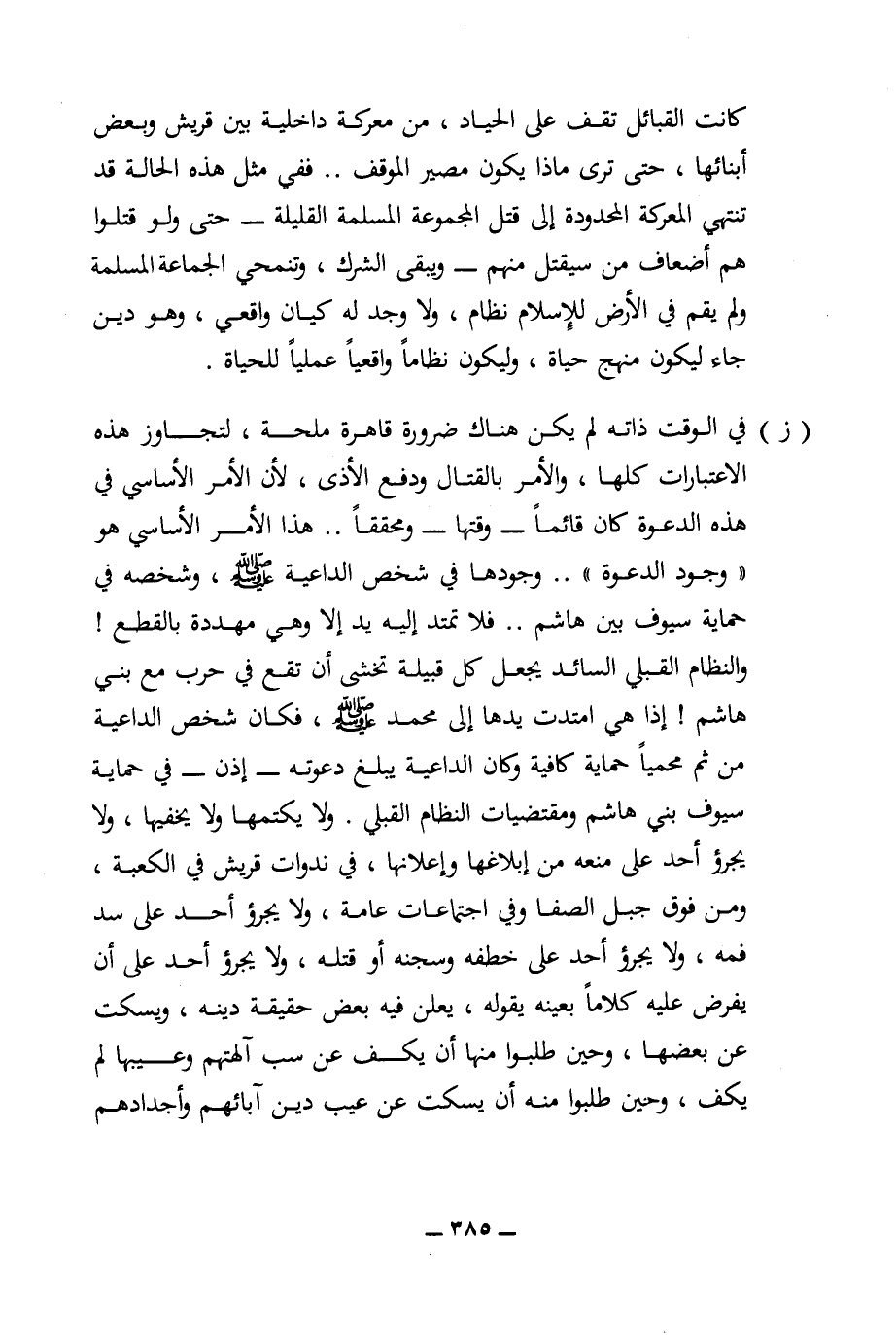 (ز) في الوقت ذاته لم يكن هناك ضرورة قاهرة ملحة، لتجاوز هذه الاعتبازت كلها، والأمر بالقتال ودفع الأذى، لأن الأمر الأساسي في هذه الدعوة كان قائما - وقتها - ومحققا .. هذا الأمر الأساسي هو ((وجود الدعوة)) .. وجودها في شخص الداعية (ص)، وشخصه في حماية سيوف بين هاشم .. فلا تمتد إليه يد إلا وهي مهددة بالقطع! والنظام القبلي السائد يجعل كل قبيلة تخشى أن تقع في حرب مع بني هاشم! إذا هي امتدت يدها إلى محمد (ص)، فكان شخص الداعية من ثم محميا حماية كافية وكان الداعية يبلغ دعوته - إذن - في حماية سيوف بني هاشم ومقتضيات النظام القبلي. ولا يكتمها ولا يخفيها، ولا يجرؤ أحد على منعه من إبلاغها وإعلانها، في ندوات قريش في الكعبة، ومن فوق جبل الصفا وفي اجتماعات عامة، ولا يجرؤ أحد على سد فمه، ولا يجرؤ أحد على خطفه وسجنه أو قتله، ولا يجرؤ أحد على أن يفرض عليه كلاما بعينه يقوله، يعلن فيه بعض حقيقة دينه، ويسكت عن بعضها، وحين طلبوا منها أن يكف عن سب آلهتهم وعيبها لم يكف، وحين طلبوا منه أن يسكت عن عيب دين آبائهم وأجدادهم
