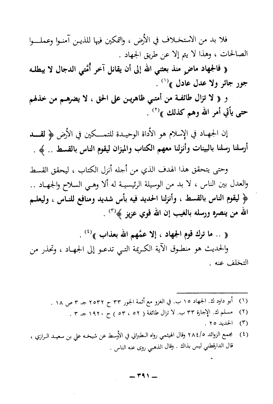 ((فالجهاد ماض منذ بعثني الله إلى أن يقاتل آخر أمتي الدجال لا يبطله جور جائر ولا عدل عادل ي (¬1).