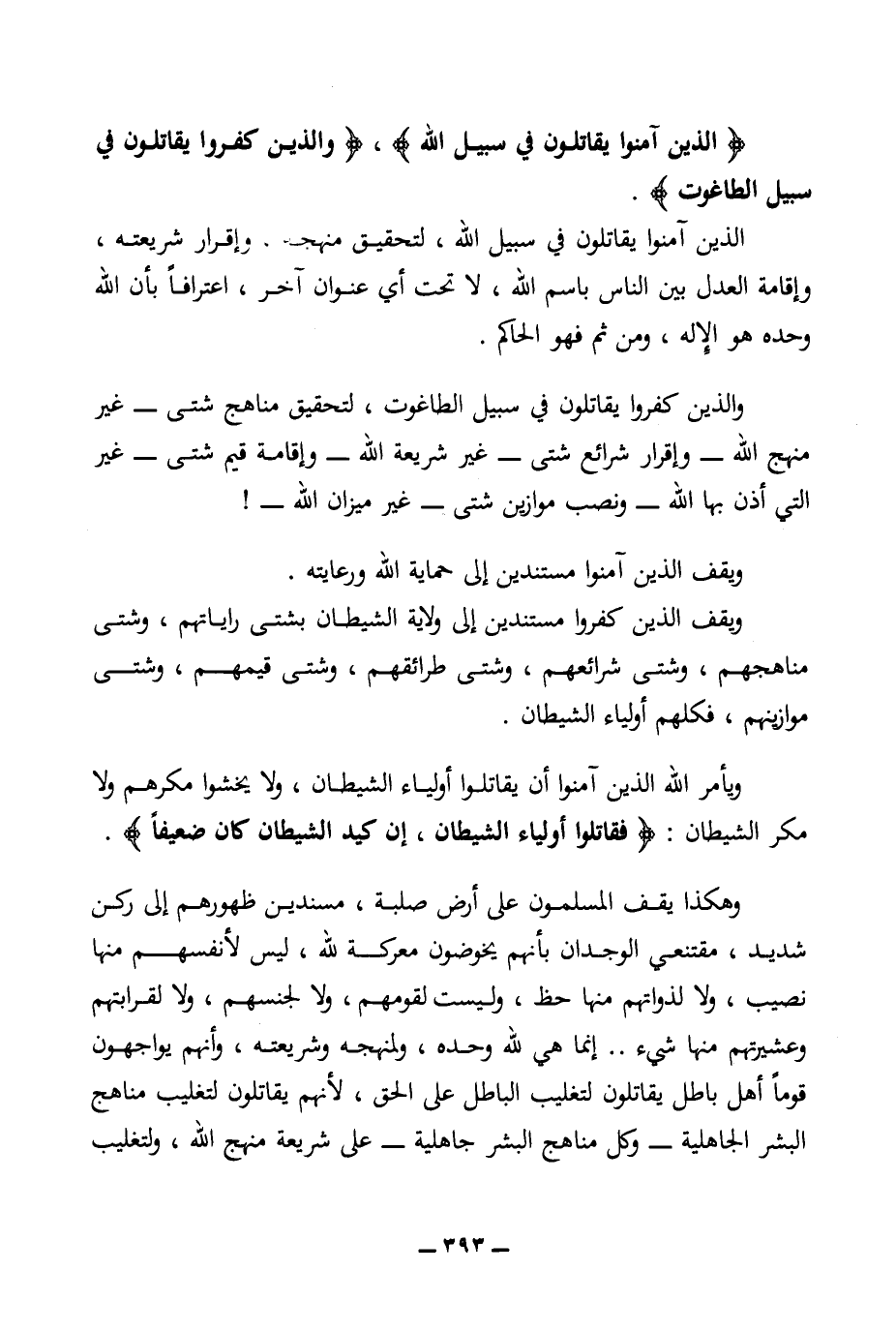 الذين آمنوا يقاتلون في سبيل الله، لتحقيق منهجه. وإقرار شريعته، وإقامة العدل بين الناس باسم الله، لا تحت أي عنوان آخر، اعترافا بأن الله وحده هو الإله، ومن ثم فهو الحاكم.