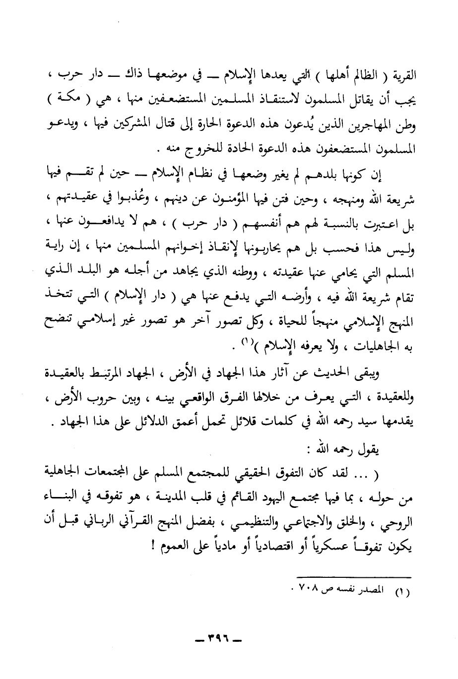 إن كونها بلدهم لم يغير وضعها في نظام الإسلام - حين لم تقم فيها شريعة الله ومنهجه، وحين فتن فيها المؤمنون عن دينهم، وعذبوا في عقيدتهم، بل اعتبرب بالنسبة لهم هم أنفسهم (دار حرب)، هم لا يدافعون عنها، وليس هذا فحسب بل هم يحاربونها لإنقاذ إخوانهم المسلمين منها، إن راية المسلم التي يحامي عنها عقيدته، ووطنه الذي يجاهد من أجله هو البلد الذي تقام شريعة الله فيه، وأرضه التي يدفع عنها هي (دار الإسلام) التي تتخذ المنهج الإسلامي منهجا للحياة، لكل تصور آخر هو تصور غير إسلامي تنضح به الجاهليات، ولا يعرفه الإسلام) (¬1).