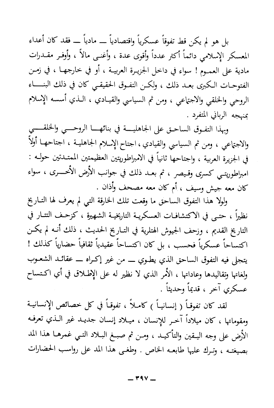 لقد كان تفوقا (إنسانيا) كاملا، تفوقا في كل خصائص الإنسانية ومقوماتها، كان ميلادا آخر للإنسان، ميلاد إنسان جديد غير الذي تعرفه الأرض على وجه اليقين والتأكيد، ومن ثم صبغ البلاد التي غمرها هذا المد بصيغته، وترك عليها طابعه الخاص. وطغى هذا المد على روسب الحضارات
