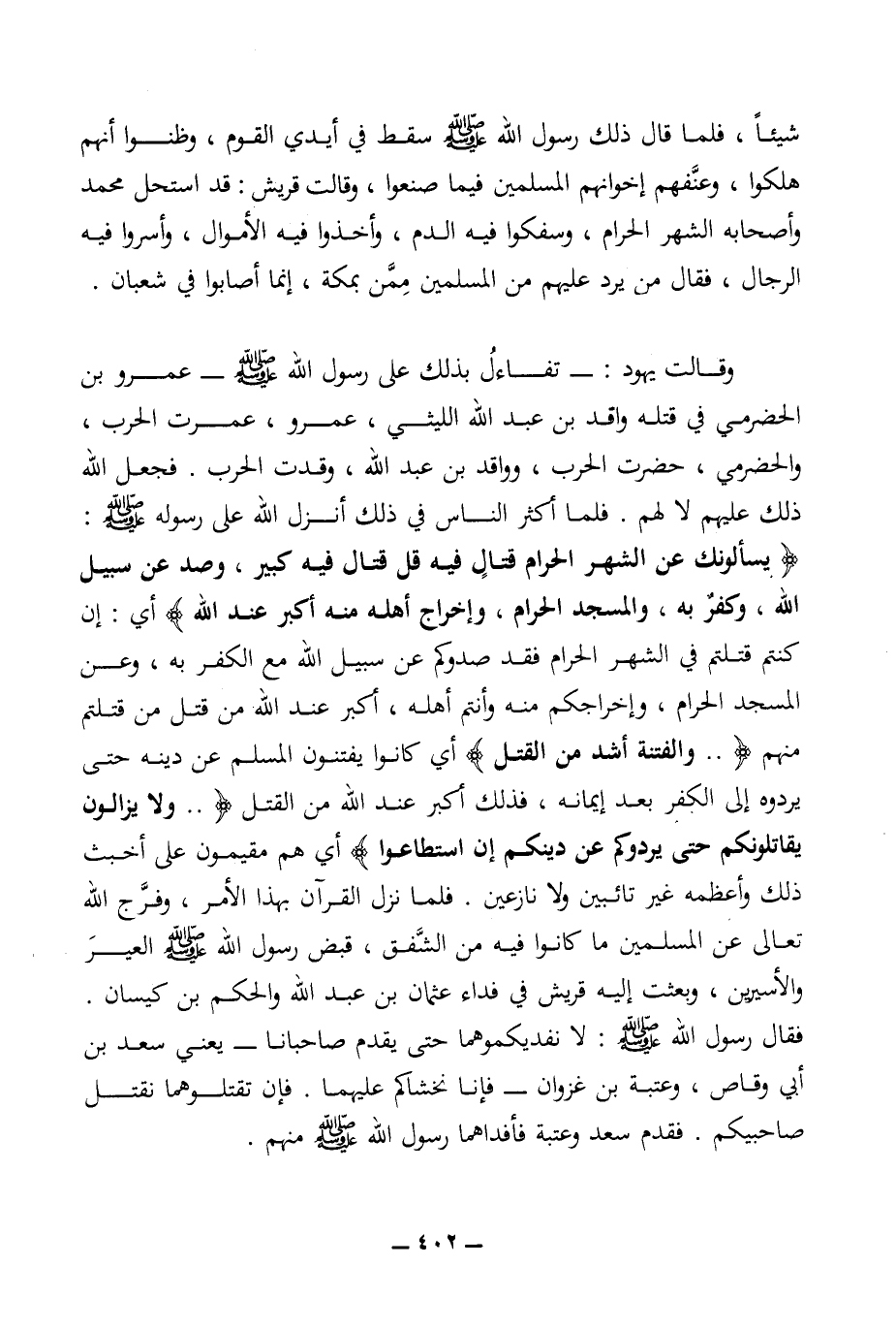 وقالت يهود: - تفاءل بذلك على رسول الله (ص) - عمرو بن الحضرمي في قتله واقد بن عبد الله الليثي، عمرو، عمرت الحرب، والحضرمي، حضرت الحرب، وواقد بن عبد الله، وقدت الحرب. فجعل الله ذلك عليهم لا لهم. فلما أكثر الناس في ذلك أنزل الله على رسوله (ص): {يسألونك عن الشهر الحرام قتال فيه قل قتال فه كبير وصد عن سبيل الله وكفر به والمسجد الحرام وإخراج أهله منه أكبر عند الله} أي: إن كنتم قتلتم في الشهر الحرام فقد صدوكم عن سبيل الله مع الكفر به، وعن المسجد الحرام، وإخراجكم منه وأنتم أهله، أكبر عند الله من قتل من قتلتم منهم {.. والفتنة أشد من القتل} أي كانوا يفتنون المسلم عن دينه حتى يردوه إلى الكفر بعد إيمانه، فذلك أكبر عند الله من القتل {.. ولا يزالون يقاتلونكم حتى يردوكم عن دينكم إن استطاعوا} أي هم مقيمون على أخبث ذلك وأعظمه غير تائبين ولا نازعين. فلما نزل القرآن بهذا الأمر، وفرج الله تعالى عن المسلمين ما كانوا فيه من الشفق، قبض رسول الله (ص) العير والأسيرين، وبعثت إليه قريش في فداء عثمان بن عبد الله والحكم بن كيسان. فقال رسول الله (ص): لا نفديكموهما حتى يقدم صاحبانا - يعني سعد بن أبي وقاص، وعتبة بن غزون - فإنا نخشاكم عليهما. فإن تقتلوهما نقتل صاحبيكم. فقدم سعد وعتبة فأفداهما رسول الله (ص) منهم.