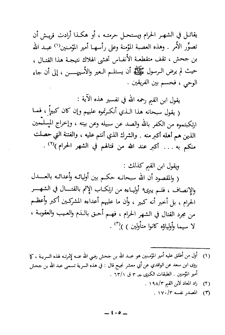 (والمقصود أن الله سبحانه حكم بين أوليائه وأعدائه بالعدل والإنصاف، فلم يبرىء أولياءه من ارتكاب الإثم بالقتال في الشهر الحرام، بل أخبر أنه كبير، وأن ما عليهم أعداءه المشركين أكبر وأعظم من مجرد القتال في الشهر الحرام، فهم أحق بالذم والعيب والعقوبة، لا سيما وأولياؤه كانوا متأولين)) (¬3).