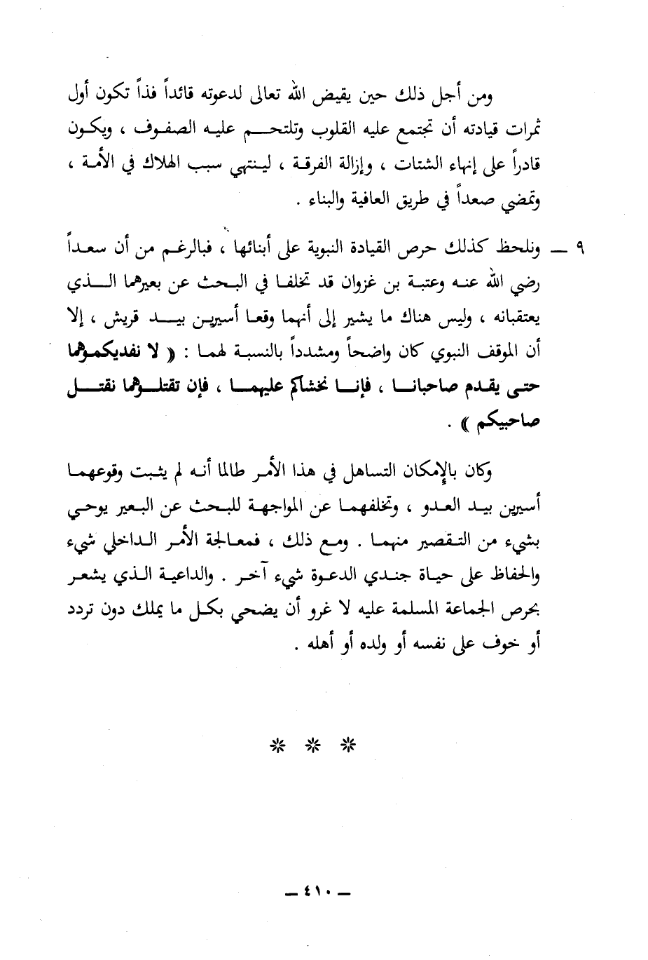 9 - ونلحظ كذلك حرص القيادة النبوية على أبنائها، فبالرغم من أن سعدا رضي الله عنه وعتبة بن غزوان قد تخلفا في البحث عن بعيرهما الذي يعتقبانه، وليس هناك ما يشير إلى أنهما وقعا أسيرين بيد قريش، إلا أن الموقف النبوي كان واضحا ومشددا بالنسبة لهما: ((لا نفديكموهما حتى يقدم صاحبانا، فإنا نخشاكم عليهما، فإن تقتلوهما نقتل