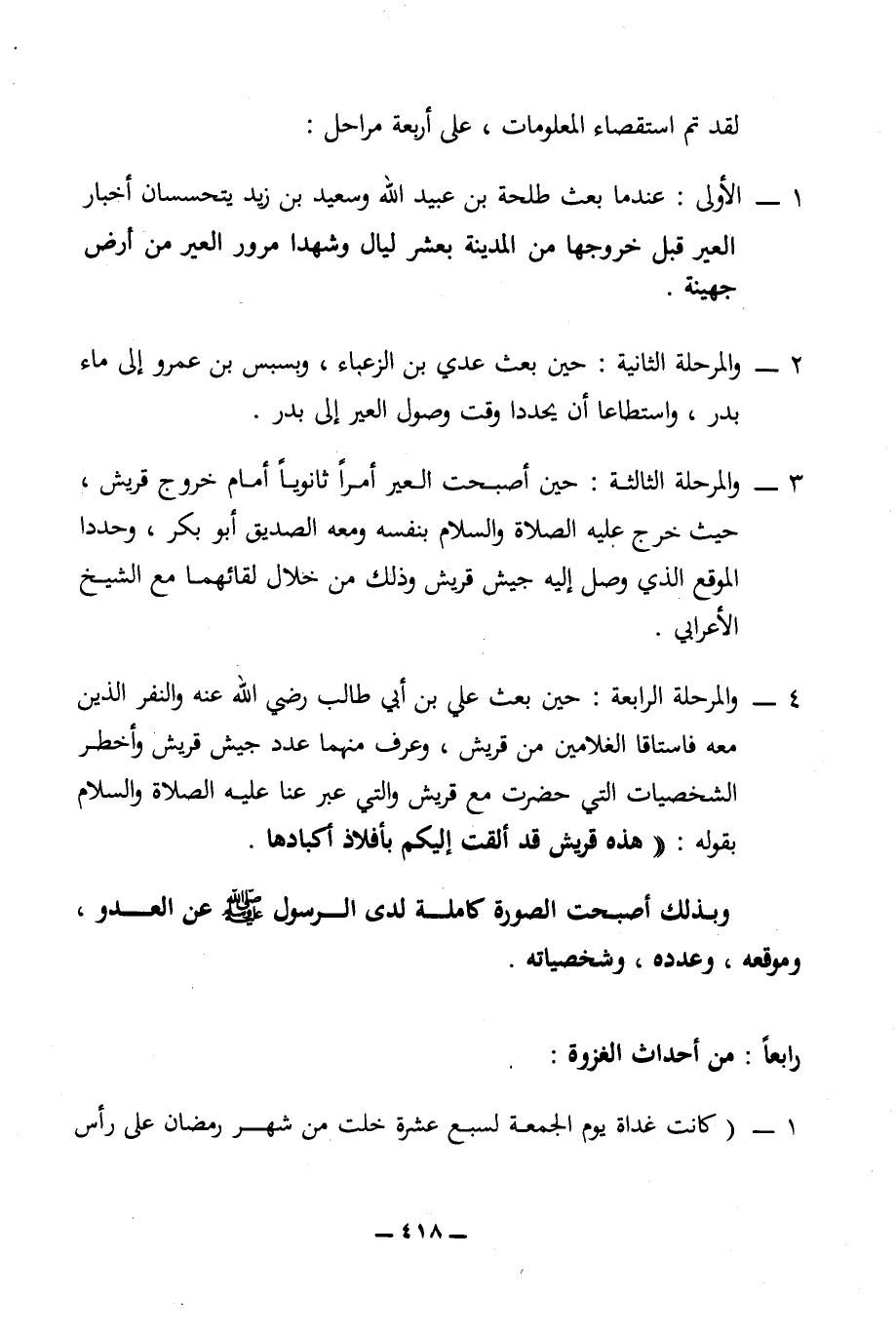4 - والمرحلة الرابعة: حين بعث علي بن أبي طالب رضي الله عنه والنفر الذين معه فاستاقا الغلامين من قريش، وعرف منهما عدد جيش قريش وأخطر الشخصيات التي حضرت مع قريش والتي عبر عنها عليه الصلاة والسلام بقوله: ((هذه قريش قد ألقت إليكم بأفلاذ أكبادها)). وبذلك أصبحت الصورة كاملة لدى الرسول (ص) عن العدو،
