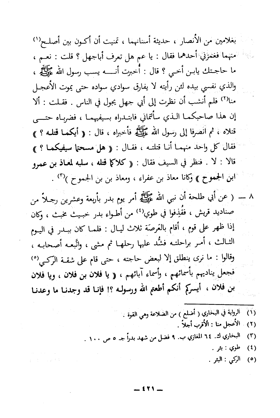 بغلامين من الأنصار، حديثة أسنانهما، تمنيت أن أكون بين أصلح (¬1) منهما فغمزني أحدهما فقال: يا عم هل تعرف أبا جهل؟ قلت: نعم، ما حاجتك يابن أخي؟ قال: أخبرت أنه يسب رسول الله (ص)، والذي نفسي بيده لئن رأيته لا يفارق سوادي سواده حتى يموت الأعجل منا (¬2) فلم أنشب أن نظرت إلى أبي جهل يجول في الناس. فقلت: ألا إن هذا صاحبكما الذي سألتماني فابتدراه بسيفيهما، فضرباه حتى قتلاه، ثم انصرفا إلى رسول الله (ص) فأخبراه، قال: ((أيكما قتله؟)) فقال كل واحد منهما أنا قلته، فقال: ((هل مسحتما سيفيكما؟)) قالا: لا. فنظر في السيف فقال: ((كلاكما قتله، سلبه لمعاذ بن عمرو ابن الجموح)) وكانا معاذ بن عفراء، ومعاذ بن الجموح) (¬3).