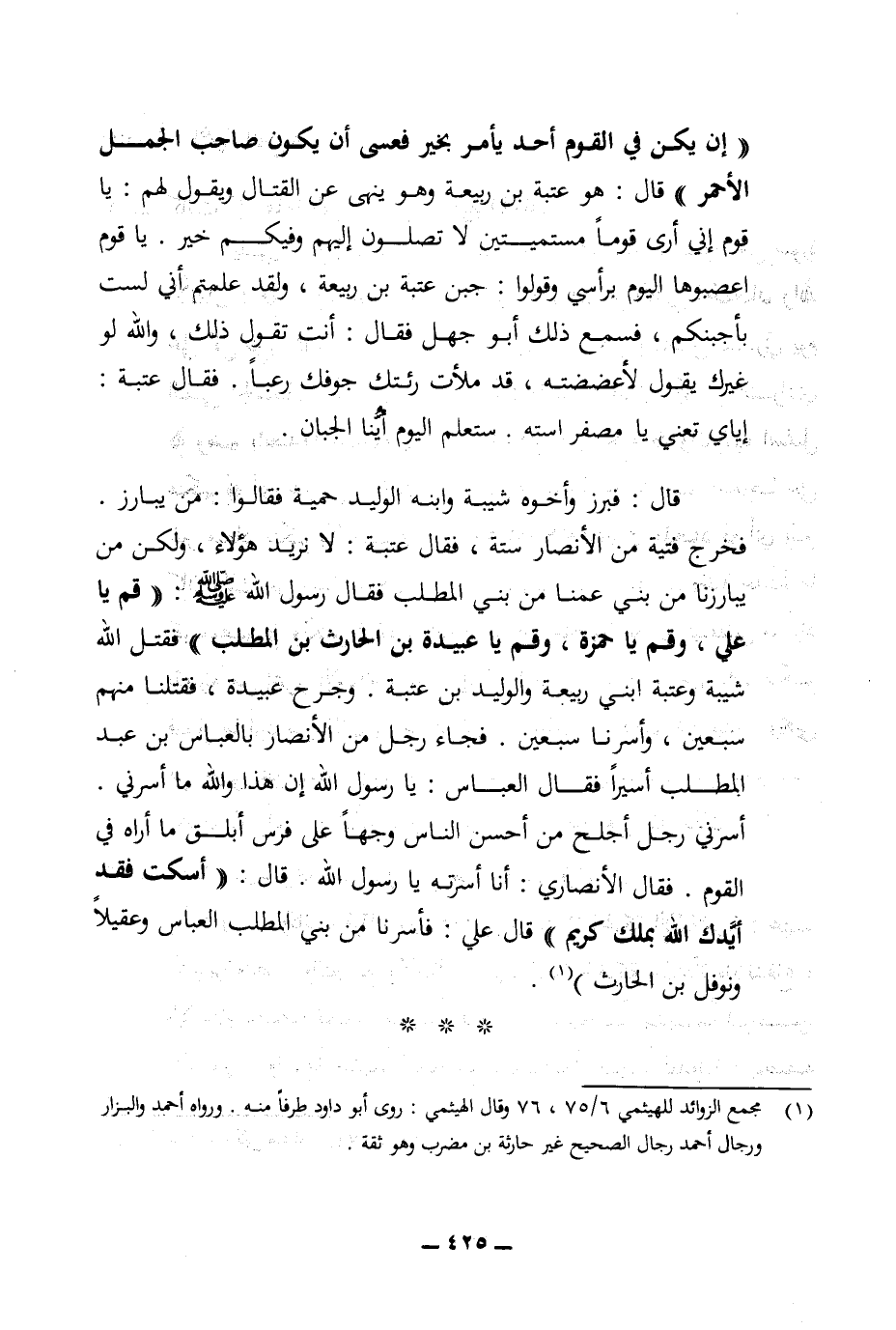 قال: فبرز وأخوه شيبة وابنه الوليد حمية فقالوا: من يبارز. فخرج فتية من الأنصار ستة، فقال عتبة: لا نريد هؤلاء، ولكن من يبارزنا من بني عمنا من بني المطلب فقال رسول الله (ص): ((قم يا علي، وقم يا حمزة، وقم يا عبيدة بن الحارث بن المطلب)) فقتل الله شيبة وعتبة ابني ربيعة والوليد بن عتبة. وجرح عبيدة، فقتلنا منهم سبعين، وأسرنا سبعين. فجاء رجل من الأنصار بالعباس بن عبد المطلب أسيرا فقال العباس: يا رسول الله إن هذا والله ما أسرني. أسرني رجل أجلح من أحسن الناس وجها على فرس أبلق ما أراه في القوم. فقال الأنصاري: أى أسرته يا رسول الله. قال: ((أسكت فقد أيدك الله بملك كريم)) قال من: فأسرنا من بني المطلب العباس وعقيلا ونوفل بن الحارث) (¬1).