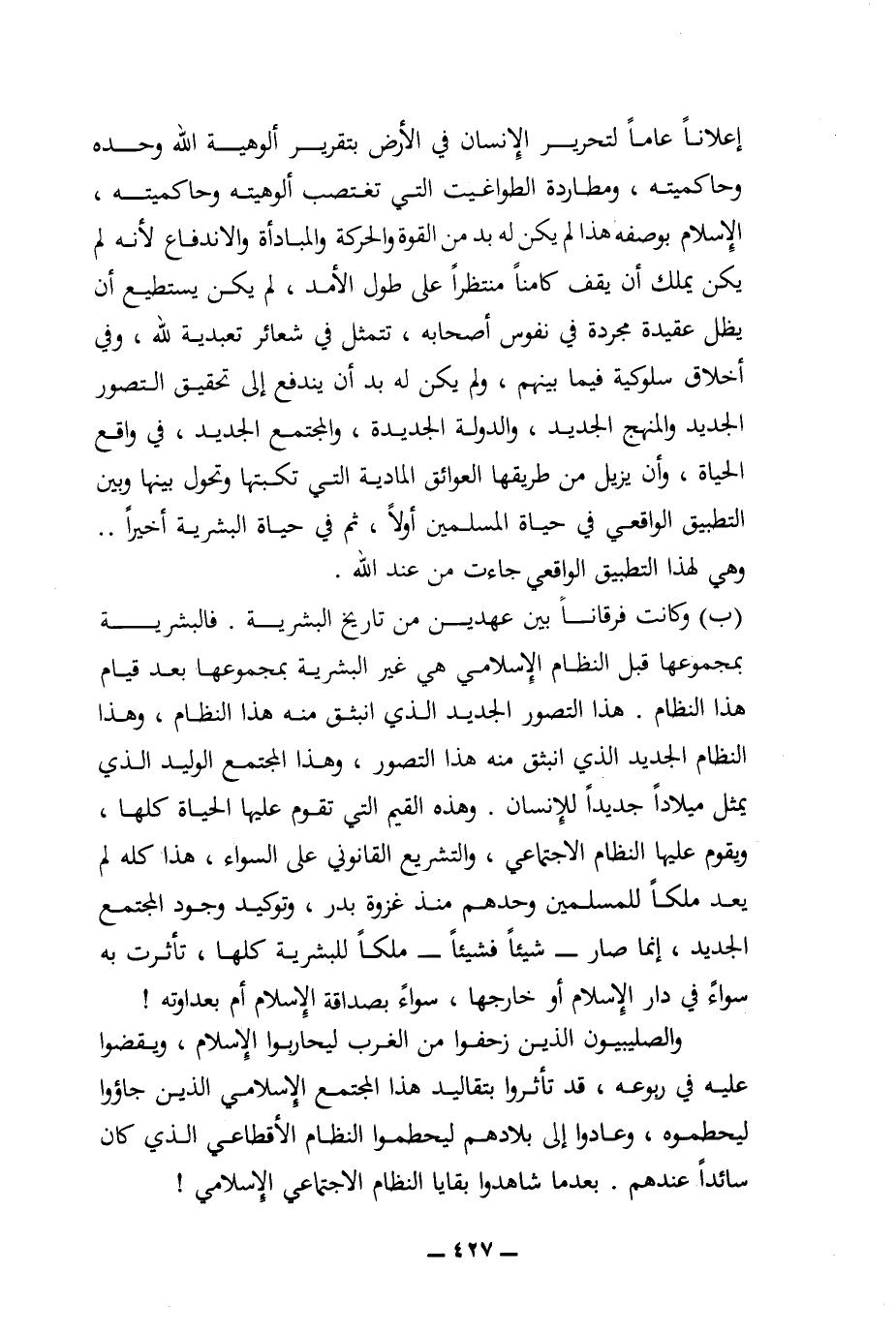 إعلانا عاما لتحرير الإنسان في الأرض بتقرير ألوهية الله وحده وحاكميته، ومطاردة الطواغيت التي تغتصب ألوهيته وحاكميته، الإسلام بوصفه هذا لم يكن له بد من القوة والحركة والمبادأة والاندفاع لأنه لم يكن يملك أن يقف كامنا منتظرا على طول الأمد، لم يكن يستطيع أن يظل عقيدة مجردة في نفوس أصحابه، تتمثل في شعائر تعبدية لله، وفي أخلاق سلوكية فيما بينهم، ولم يكن له بد أن يندفع إلى تحقيق التصور الجديد والمنهج الجديد، والدولة الجديدة، والمجتمع الجديد، في واقع الحياة، وأن يزيل من طريقها العوائق المادية التي تكبتها وتحول بينها وبين التطبيق الواقعي في حياة المسلمين أولا، ثم في حياة البشرية أخيرا .. وهي لهذا التطبيق الواقعي جاءت من عند الله.