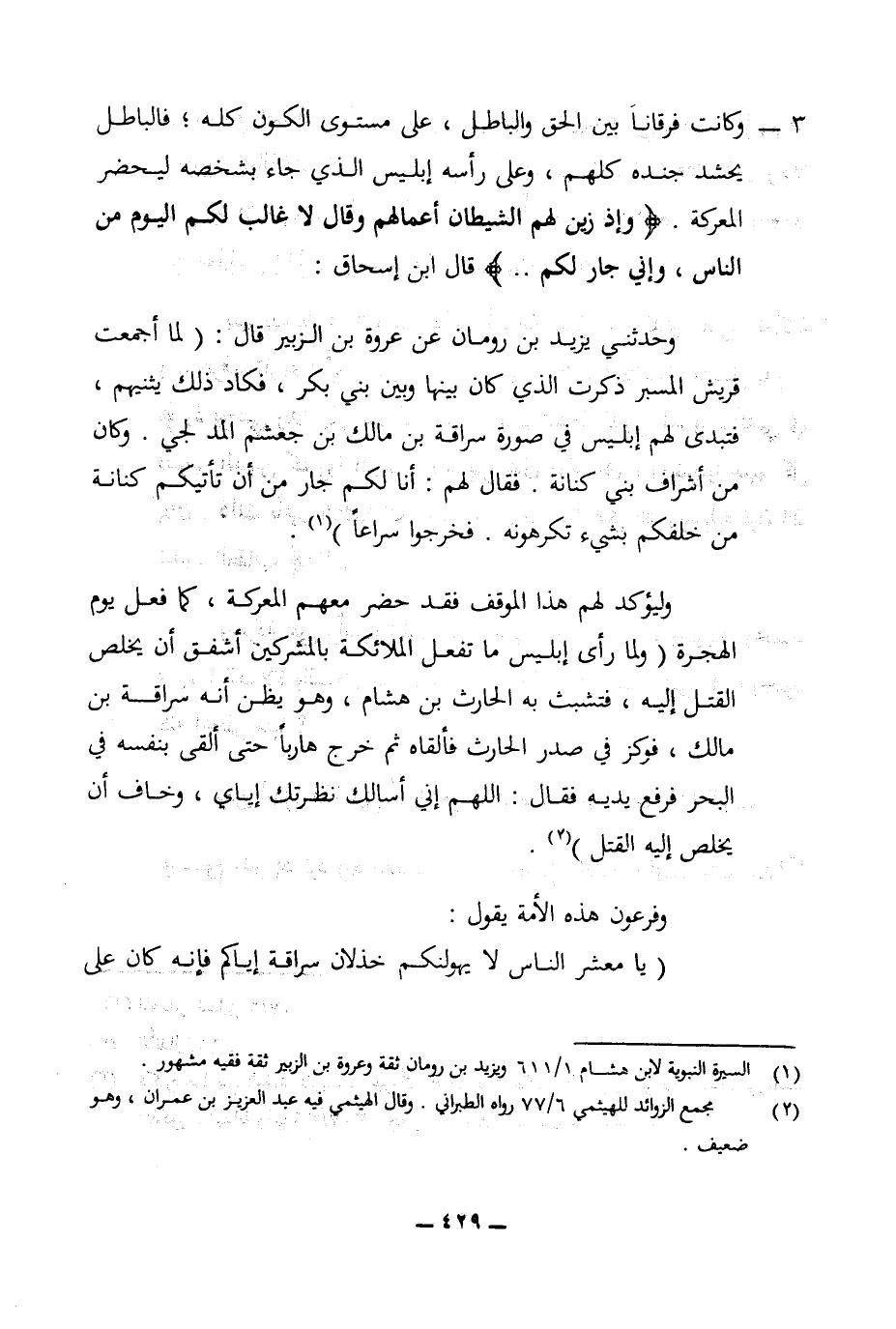 وحدثني بزيد بن رومان عن عروة بن الزبير قال: (لما أجمعت قريش المسير ذكرت الذي كان بينها وبين بني بكر، فكاد ذلك يثنيهم، فتبدى لهم إبليس في صورة سراقه بن مالك بن جعشم المدلجي. من أشراف بني كنانة. فقال لهم: أنا لكم جار من أن تأتيكم كنانة من خلفكم بشيء تكرهونه. فخرجوا سراعا) (¬1).