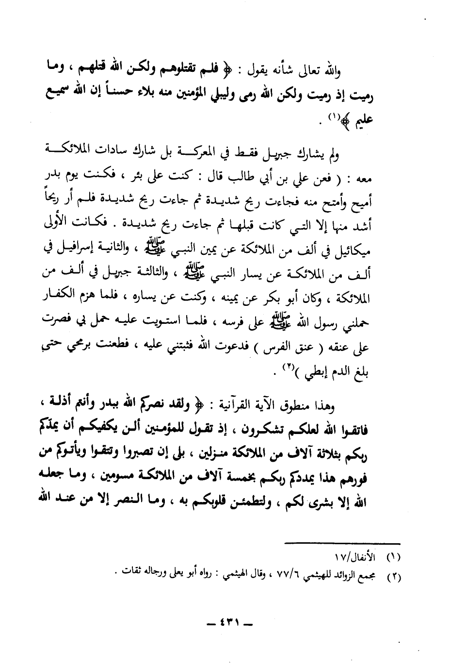وهذا منطوق الآية القرآنية: {ولقد نصركم الله ببدر وأنتم أذلة فاتقوا الله لعلكم تشكرون إذ تقول للمؤمنين ألن يكفيكم أن يمدكم ربكم بثلاثة آلاف من الملائكة منزلين بلى إن تصبروا وتتقوا ويأتوكم من فورهم هذا يمددكم ربكم بخمسة آلاف من الملائكة مسومين وما جعله الله إلا بشرى لكم ولتطمئن قلوكم به وما النصر إلا من عند الله