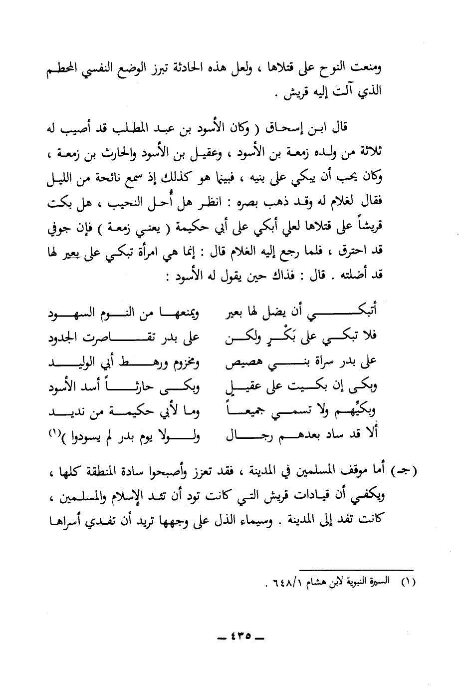 قال ابن إسحاق (وكان الأسود بن عبد المطلب قد أصيب له ثلاثة من ولده زمعة بن الأسود، وعقيل بن الأسود والحارث بن زمعة، وكان يحب أن يبكي على بنيه، فبينما هو كذلك إذ سمع نائحة من الليل فقال لغلام له وقد ذهب بصره: انظر هل أحل النحيب، هل بكت قريشا على قتلاها لعلي أبكي على أبي حكيمة (يعني زمعة) فإن جوفي قد احترق، فلما رجع إليه الغلام قال: إنما هي امرأة تبكي على بعير لها قد أضلته. قال: فذاك حين يقول له الأسود: