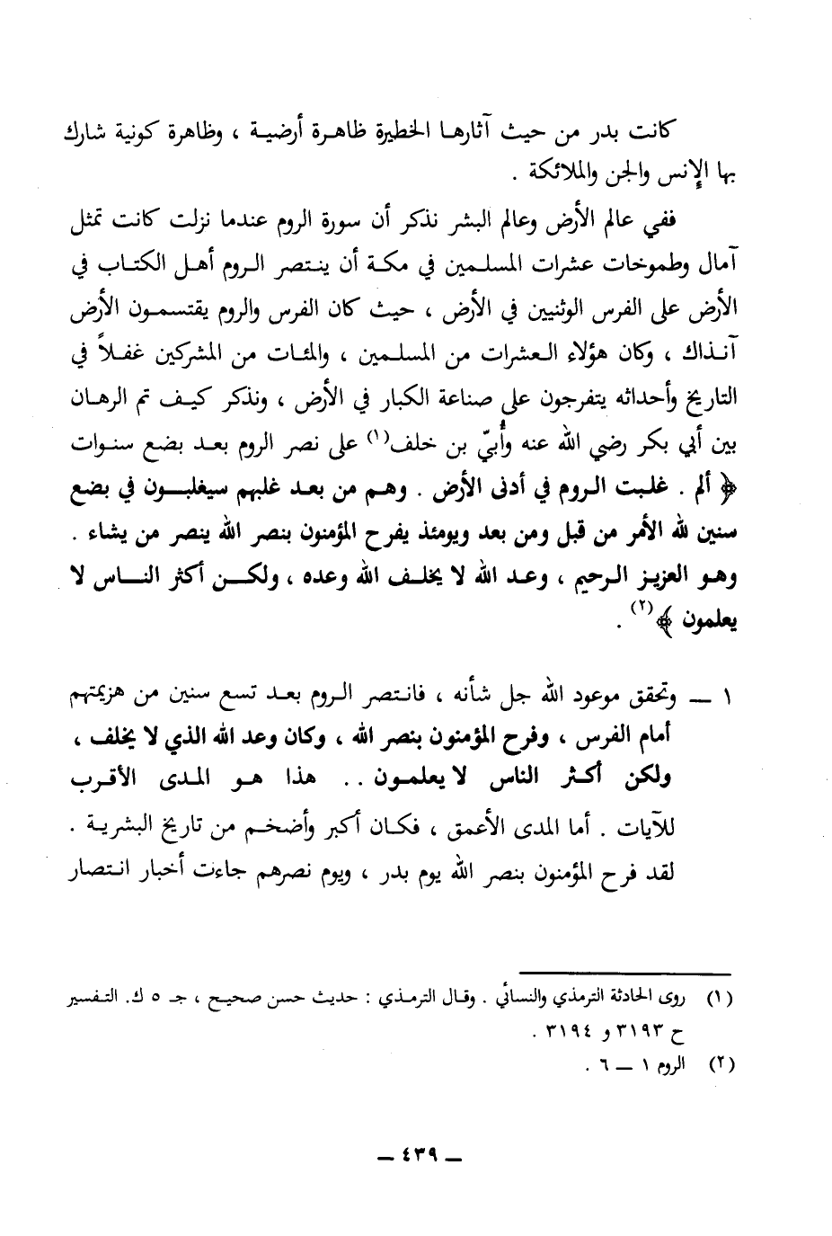 1 - وتحقق موعود الله جل شأنه، فانتصر الروم بعد تسع سنين من هزيمتهم أمام الفرس، وفرح المؤمنون بنصر الله، وكان وعد الله الذي لا يخلف، ولكن أكثر الناس لا يعلمون .. هذا هو المدى الأقرب