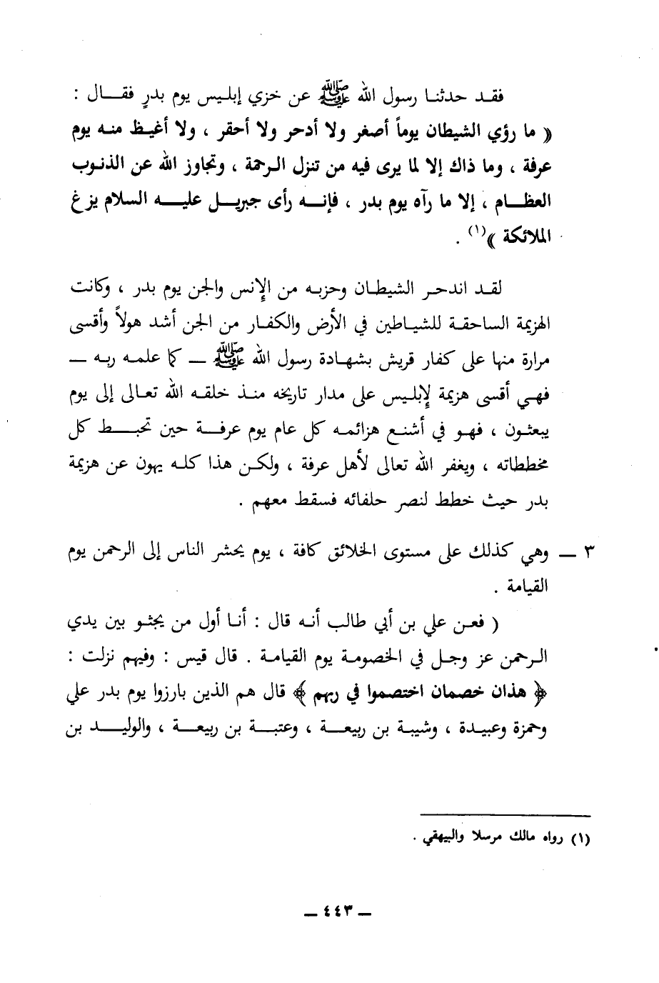 فقد حدثنا رسول الله (ص) عن خزي إبليس يوم بدر فقال: ((ما رؤي الشيطان يوما أصغر ولا أدحر ولا أحقر، ولا أغيظ منه يوم عرفة، وما ذاك إلا لما يرى فيه من تنزل الرحمة، وتجاوز الله عن الذنوب العظام، إلا ما رآه يوم بدر، فإنه رأى جبربل عليه السلام يزغ الملائكة)) (¬1).