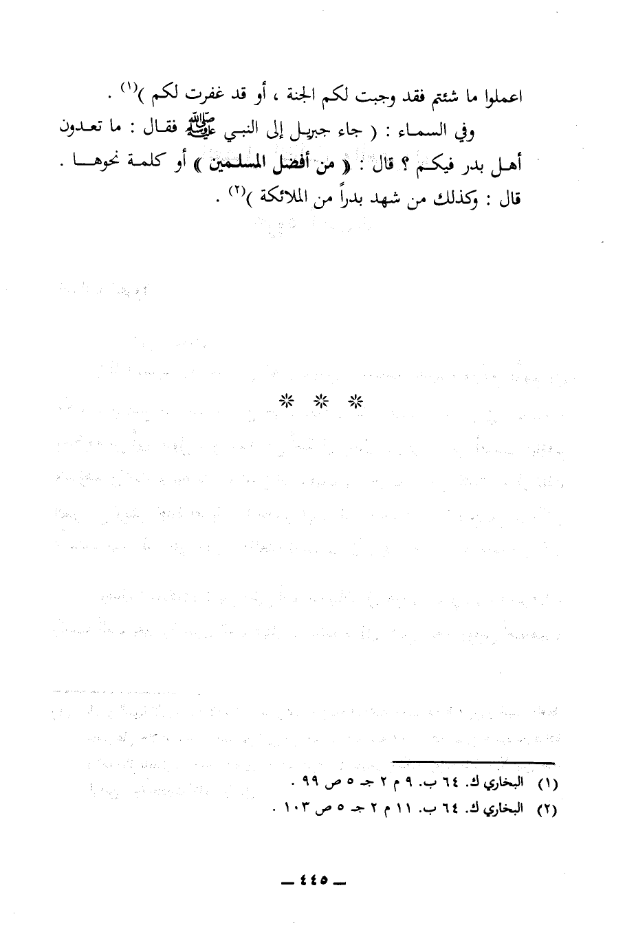 وفي السماء: (جاء جبريل إلى النبي (ص) فقال: ما تعدون أهل بدر فيكم؟ قال: ((من أفضل المسلمين)) أو كلمة نحوها. قال: وكذلك من شهد بدرا من الملائكة) (¬2).