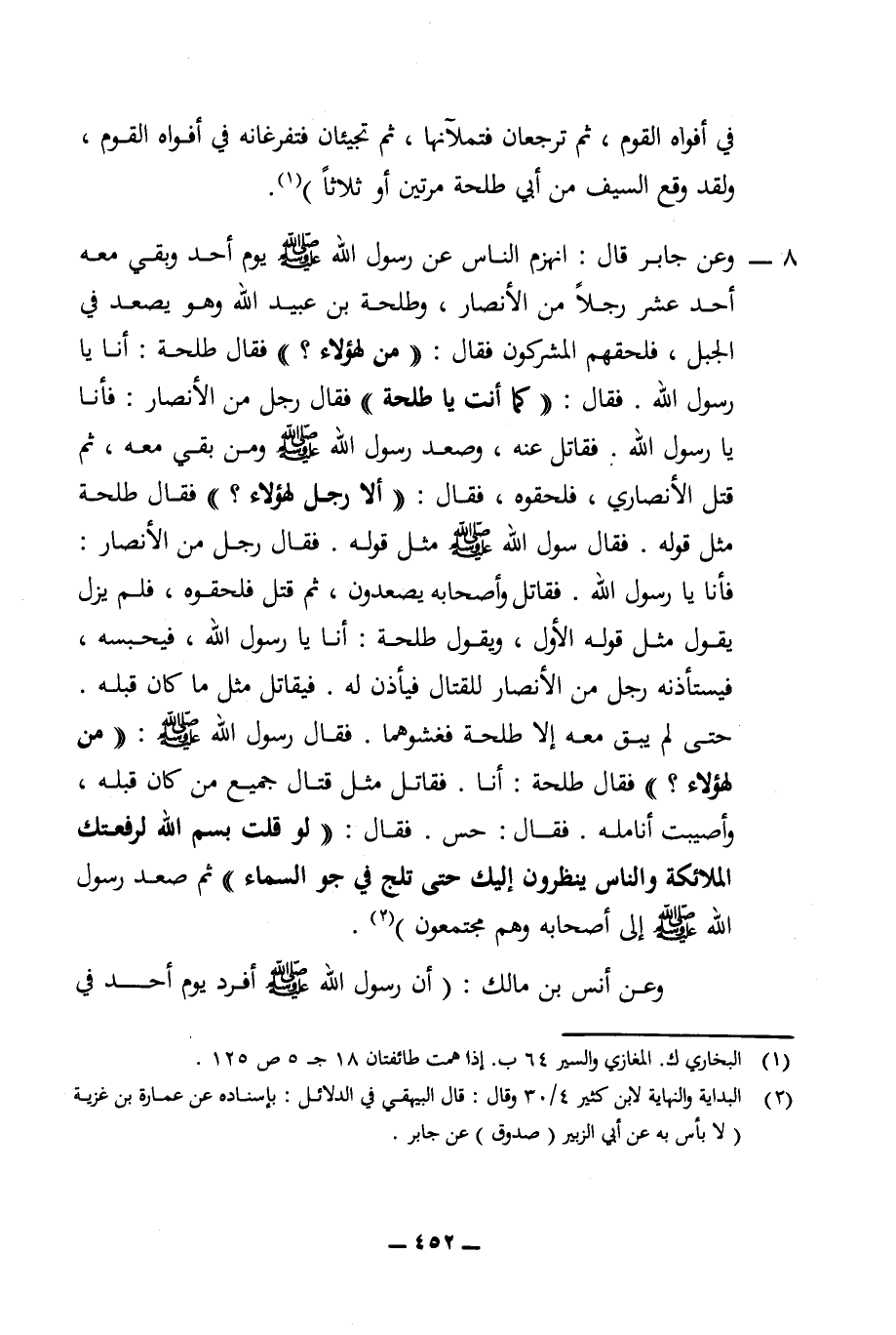 8 - وعن جابر قال: انهزم الناس عن رسول الله (ص) يوم أحد وبقي معه أحد عشر رجلا من الأنصار، وطلحة بن عبيد الله وهو يصعد في الجبل، فلحقهم المشركون فقال: ((من لهؤلاء؟)) فقال طلحة: أنا يا رسول الله. فقال: ((كما أنت يا طلحة)) فقال رجل من الأنصار: فأنا يا رسول الله. فقاتل عنه، وصعد رسول الله (ص) ومن بقي معه، ثم قتل الأنصاري، فلحقوه، فقال: ((ألا رجل لهؤلاء؟)) فقال طلحة مثل قوله. فقال رسول الله (ص) مثل قوله. فقال رجل من الأنصار: فأنا يا رسول الله (ص) فقاتل وأصحابه يصعدون، ثم قتل فلحقوه، فلم يزل يقول مثل قوله الأول، ويقول طلحة: أنا يا رسول الله، فيحبسه، فيسأذنه رجل من الأنصار للقتال فيأذن له. فيقاتل مثل ما كان قبله.
