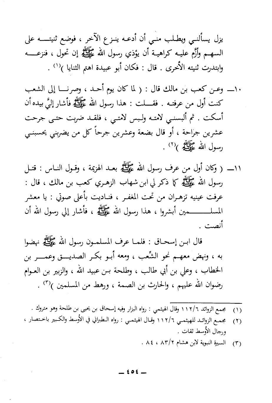10 - وعن كعب بن مالك قال: (لما كان يوم أحد، وصرنا إلى الشعب كنت أول من عرفته. فقلت: هذا رسول الله (ص) فأشار إلي بيده أن أسكت. ثم ألبسني لأمته ولبس لأمتي، فلقد ضربت حتى جرحت عشرين جراحة، أو قال بضعة وعشرين جرحا كل من يضربني يحسبني رسول الله (ص)) (¬2).