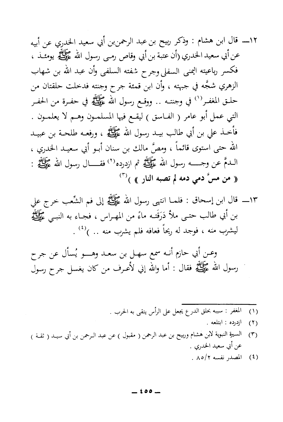 12 - قال ابن هشام: وذكر ربيح بن عبد الرحمن بن أبي سعيد الخدري عن أبيه عن أبي سعيد الخدري (أن عتبة بن أبي وقاص رمى رسول الله (ص) يومئذ، فكسر رباعيته اليمنى السفلى وجرح شفته السلفى وأن عبد الله بن شهاب الزهري شجه في جبهته، وأن ابن قمئة جرح وجنته فدخلت حلقتان من حلق المغفر (¬1) في وجنته .. ووقع رسول الله (ص) في حفرة من الحفر التي عمل أبو عامر (الفاسق) ليقع فيها المسلمون وهم لا يعلمون. فأخذ علي بن أبي طالب بيد رسول الله (ص)، ورفعه طلحة بن عبيد الله حتى استوى قائما، ومص مالك بن سنان أبو أبي سعيد الخدري، الدم عن وجه رسول الله (ص) ثم ازدرده (¬2) فقال رسول الله (ص): ((من مس دمي دمه لم تصبه النار))) (¬3).
