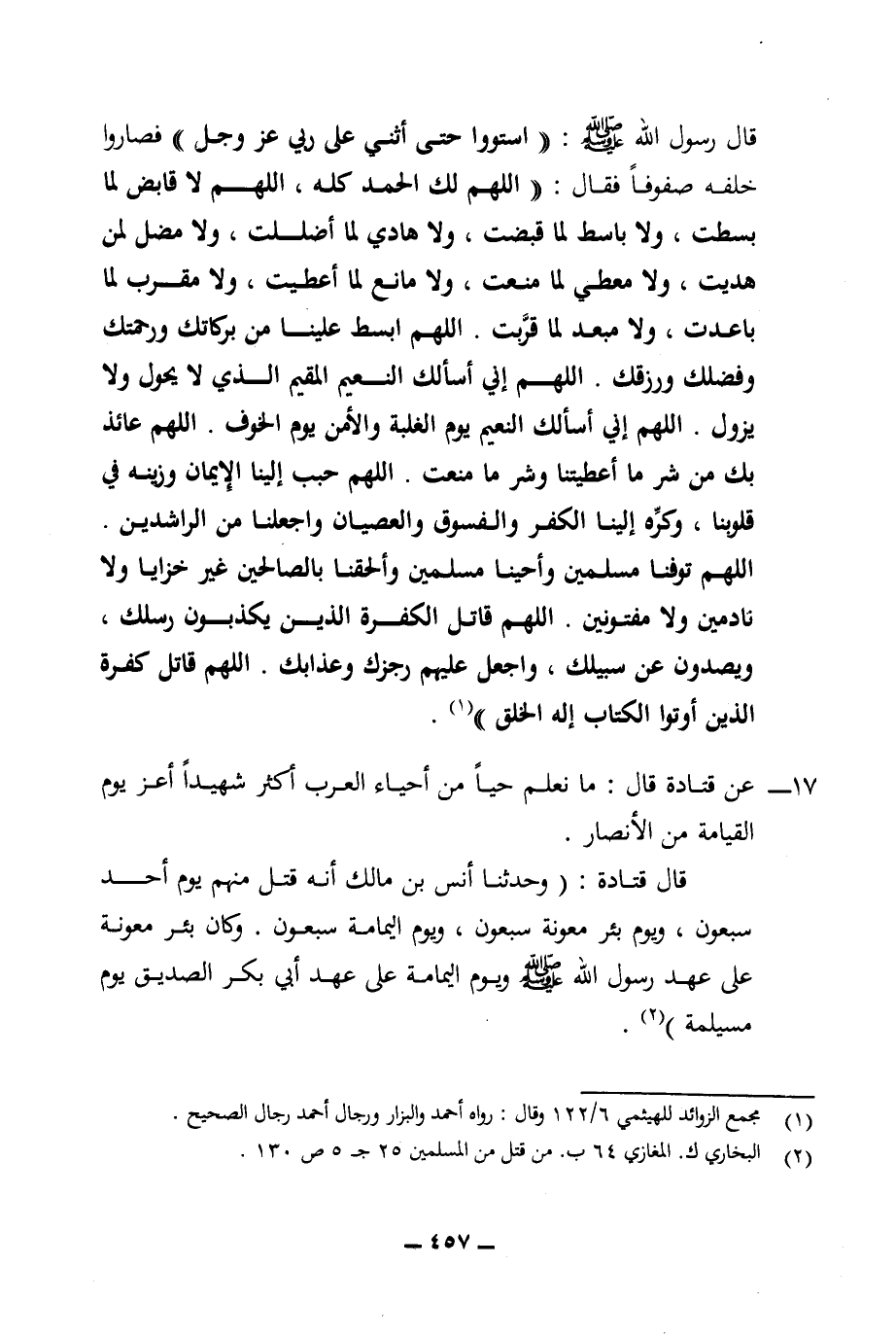 قال رسول الله (ص): ((استووا حتى أثني على ربي عز وجل)) فصاروا خلفه صفوفا فقال: ((اللهم لك الحمد كله، اللهم لا قابض لما بسطت، ولا باسط لما قبضت، ولا هادي لما أضللت، ولا مضل لمن هديت، ولا معطي لما منعت، ولا مانع لما أعطيت، ولا مقرب لما باعدت، ولا مبعد لما قربت. اللهم ابسط علينا من بركاتك ورحمتك وفضلك ورزقك. اللهم إني أسألك النعيم المقيم الذي لا يحول ولا يزول. اللهم إني أسألك النعيم يوم الغلبة والأمن يوم الخوف. اللهم عائذ بك من شر ما أعطيتنا وشر ما منعت. اللهم حبب إلينا الإيمان وزينه في قلوبنا، وكره إلينا الكفر والفسوق والعصيان واجعلنا من الراشدين.