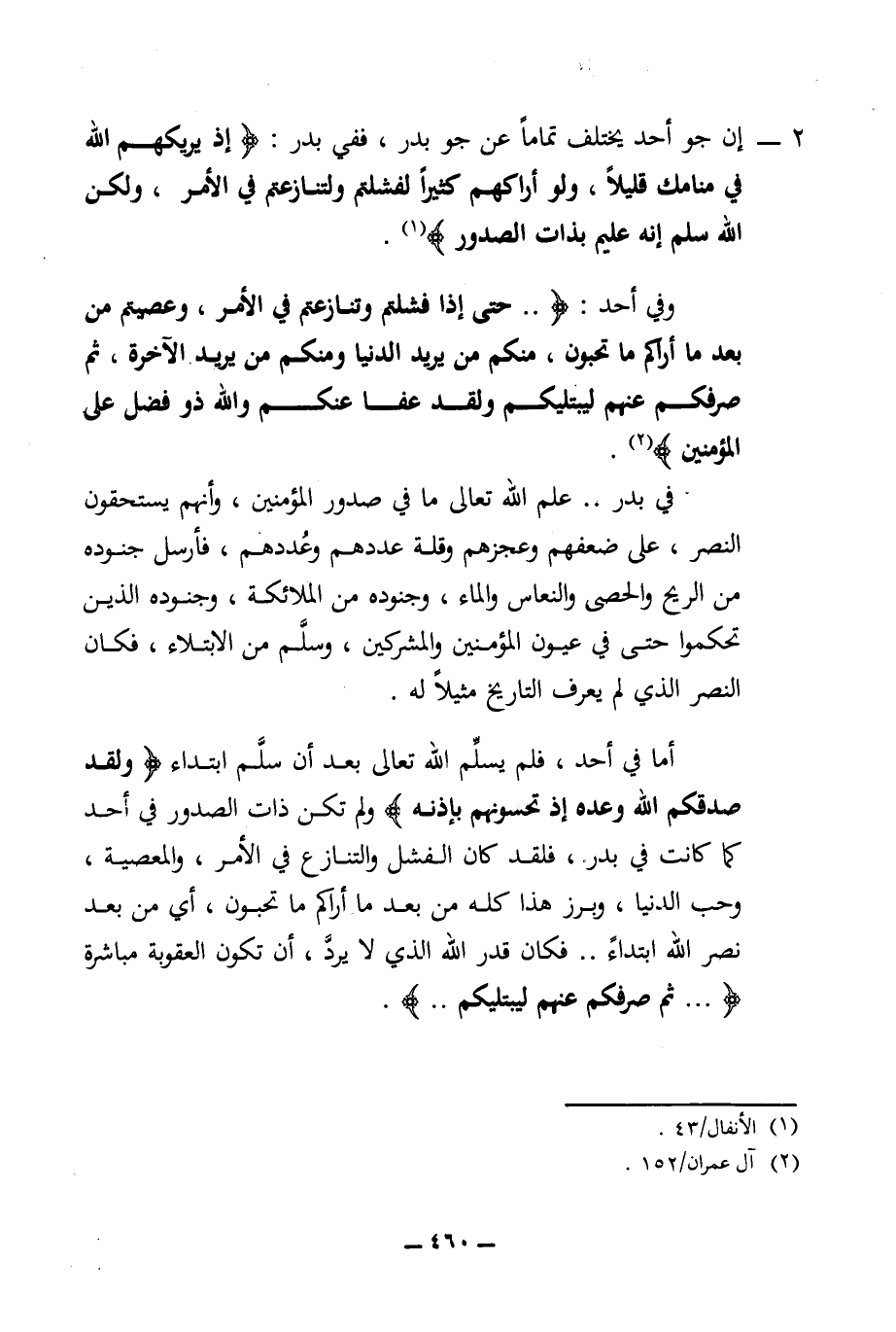 2 - إن جو أحد يختلف تماما عن جو بدر، ففي بدر: {إذ يريكهم الله في منامك قليلا ولو أراكهم كثيرا لفشلتم ولتنازعتم في الأمر ولكن الله سلم إنه عليم بذات الصدور} (¬1).