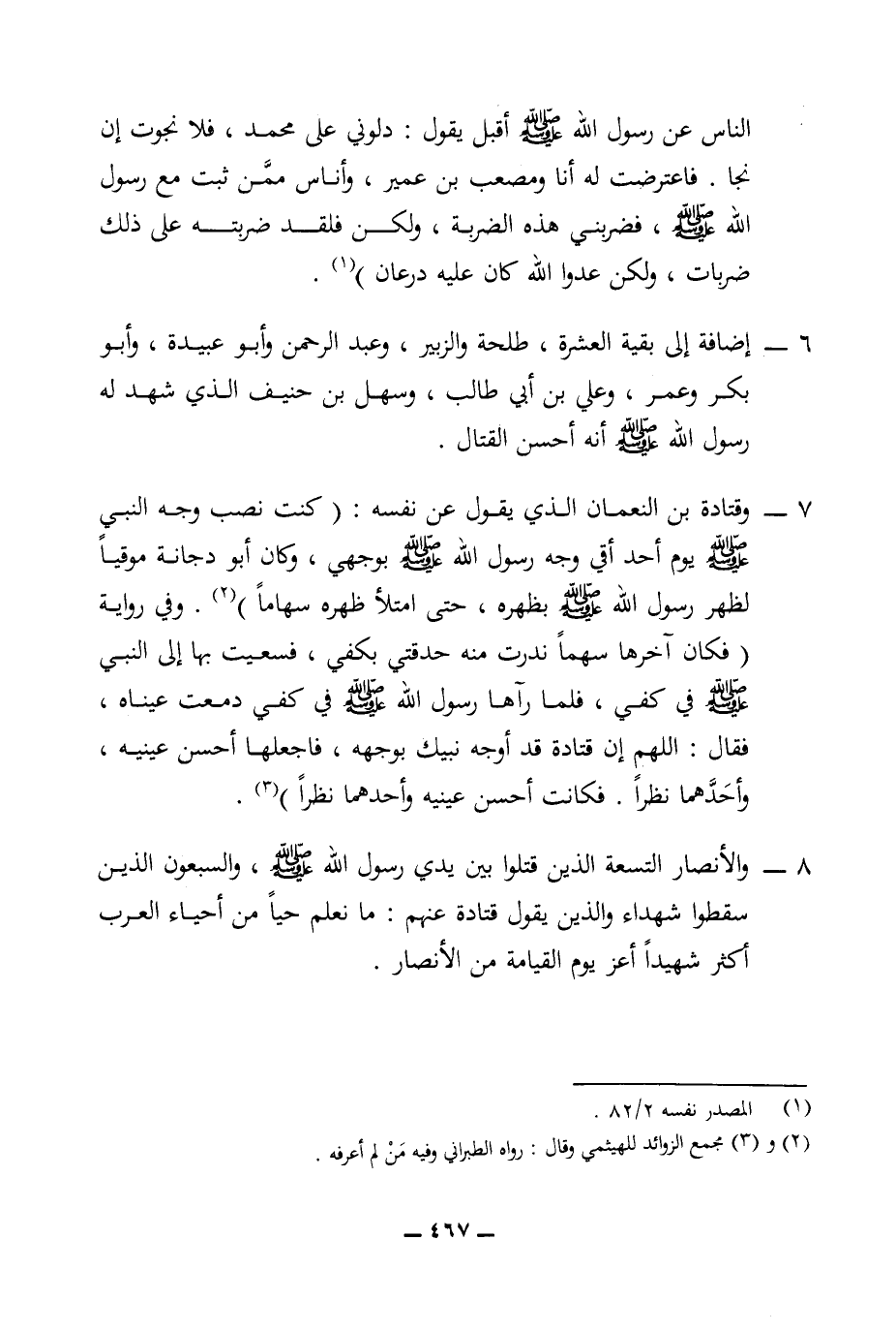 7 - وقتادة بن النعمان الذي يقول عن نفسه: (كنت نصب وجه النبي (ص) يوم أحد أقي وجه رسول الله (ص) بوجهي، وكان أبو دجانة موقيا لظهر رسول الله (ص) بظهره، حتى امتلأ ظهره سهاما) (¬2). وفي رواية (فكان آخرها سهما ندرت مته حدقتي بكفي، فسعيت بها إلى النبي (ص) في كفي، فلما رآها رسول الله (ص) في كفي دمعت عيناه،