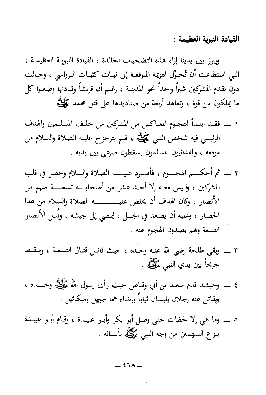 1 - فقد ابتدأ الهجوم المعاكس من المشركين من خلف المسلمين والهدف الرئيسي فيه شخص النبي (ص)، فلم يتزحزح عليه الصلاة والسلام من موقعه، والفدائيون المسلمون يسقطون صرعى بين يديه.