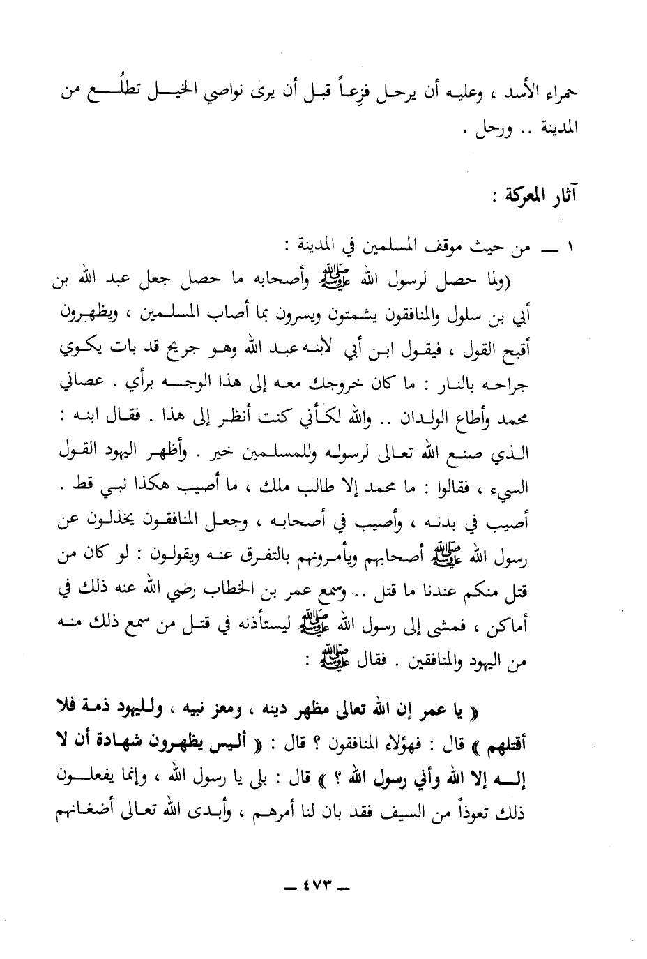 ((يا عمر إن الله تعالى مظهر دينه، ومعز نبيه، ولليهود ذمة فلا أقتلهم)) قال: فهؤلاء المنافقون؟ قال: ((أليس يظهرون شهادة أن لا إله إلا الله وأني رسول الله؟)) قال: بلى يا رسول الله، وإنما يفعلون ذلك تعوذا من السيف فقد بان لنا أمرهم، وأبدى الله تعالى أضغانهم
