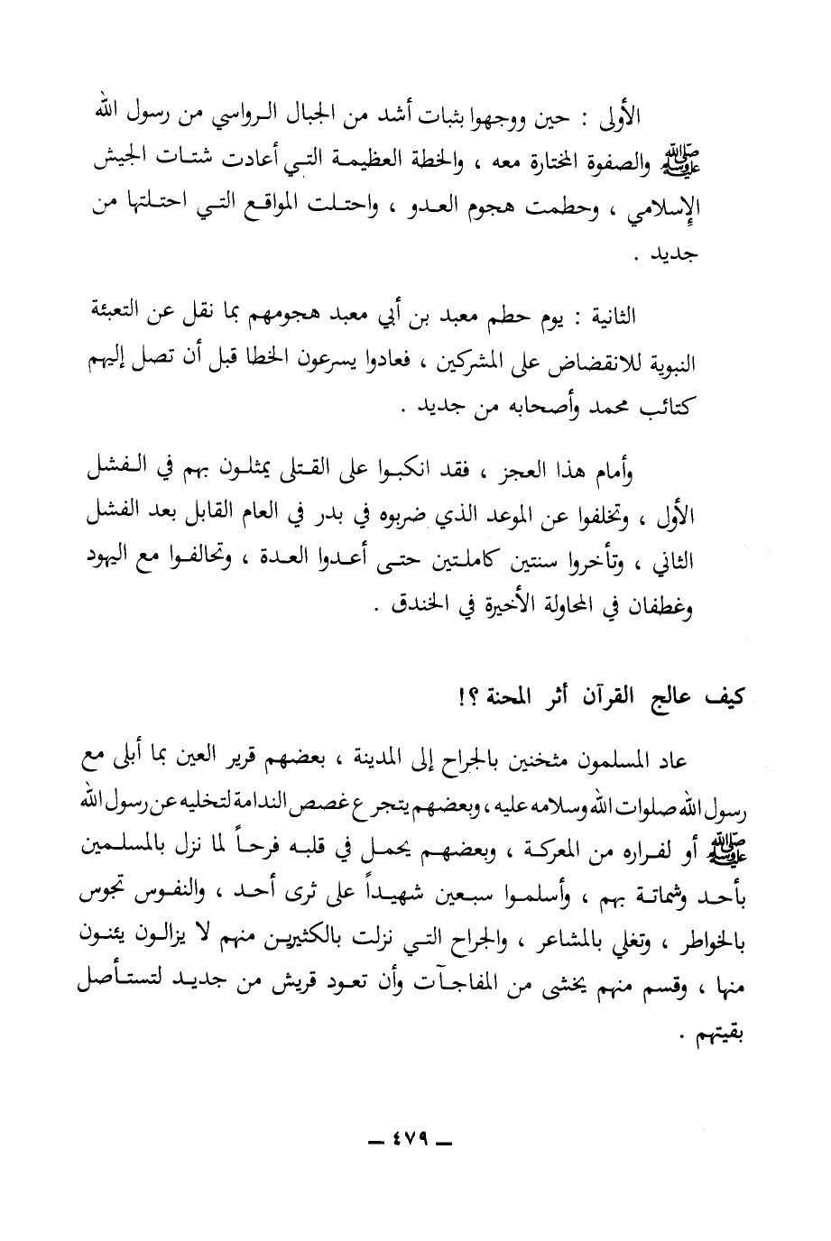 الأولى: حين ووجهوا بثبات أشد من الجبال الرواسي من رسول الله (ص) والصفوة المختارة معه، والخطة العظيمة التي أعادت شتات الجيش الإسلامي، وحطمت هجوم العدو، واحتلت المواقع التي احتلتها من جديد.