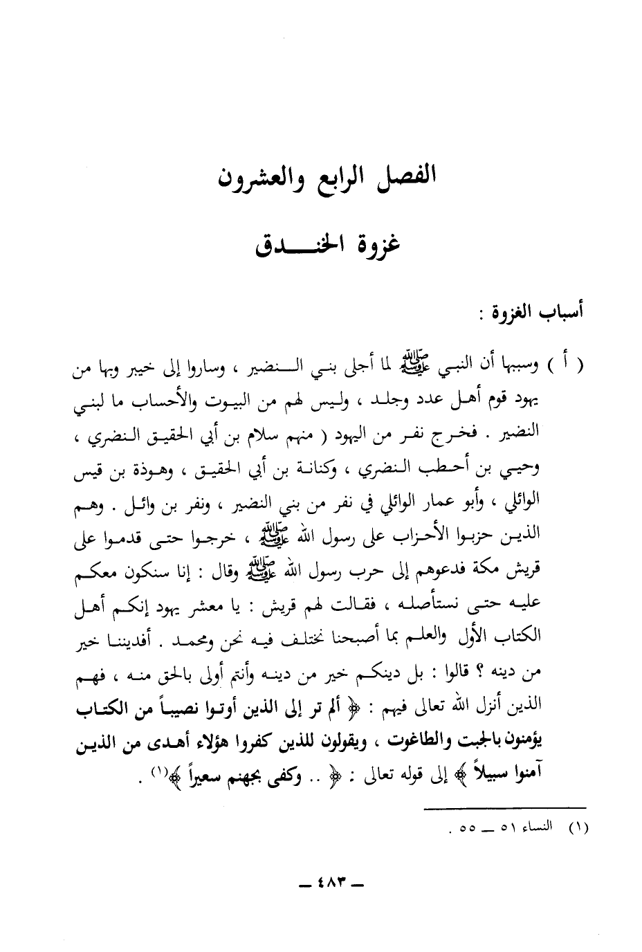 (أ) وسببها أن النبي (ص) لما أجل بني النضير، وساروا إلى خيبر وبها من يهود قوم أهل عدد وجلد، وليس لهم من البيوت والأحساب ما لبني النضير. فخرج نفر من اليهود (منهم سلام بن أبي الحقيق النضري، وحيي بن أخطب النضري، وكنانة بن أبي الحقيق، وهوذة بن قيس الوائلي، وأبو عمار الوائلي في نفر من بني النضير، ونفر بن وائل. وهم الذين حزبوا الأحزاب على رسول الله (ص)، خرجوا حتى قدمو على قريش مكة فدعوهم إلى حرب رسول الله (ص) وقال: إنا سنكون معكم عليه حتى نستأصله، فقالت لهم قريش: يا معشر يهود إنكم أهل الكتاب الأول والعلم بما أصبحنا نختلف فيه نحن ومحمد. أفديننا خير من دينه؟ قالوا: بل دينكم خير من دينه وأنتم أولى بالحق منه، فهم الذين أنزل الله تعالى فيهم: {ألم تر إلى الذين أوتوا نصيبا من الكتاب يؤمنون بالجبت والطاغوت ويقولون للذين كفروا هؤلاء أهدى من الذين آمنوا سبيلا} إلى قوله تعالى: {.. وكفى يجهنم سعيرا} (¬1).