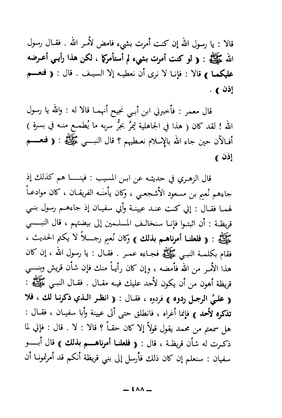 قالا: يا رسول الله إن كنت أمرت بشيء فامض لأمر الله. فقال رسول الله (ص): ((لو كنت أمرت بشيء لم أستأمركما، لكن هذا رأيي أعرضه عليكما)) قالا: فإنا لا نرى أن نعطيه إلا السيف. قال: ((فنعم إذن)).