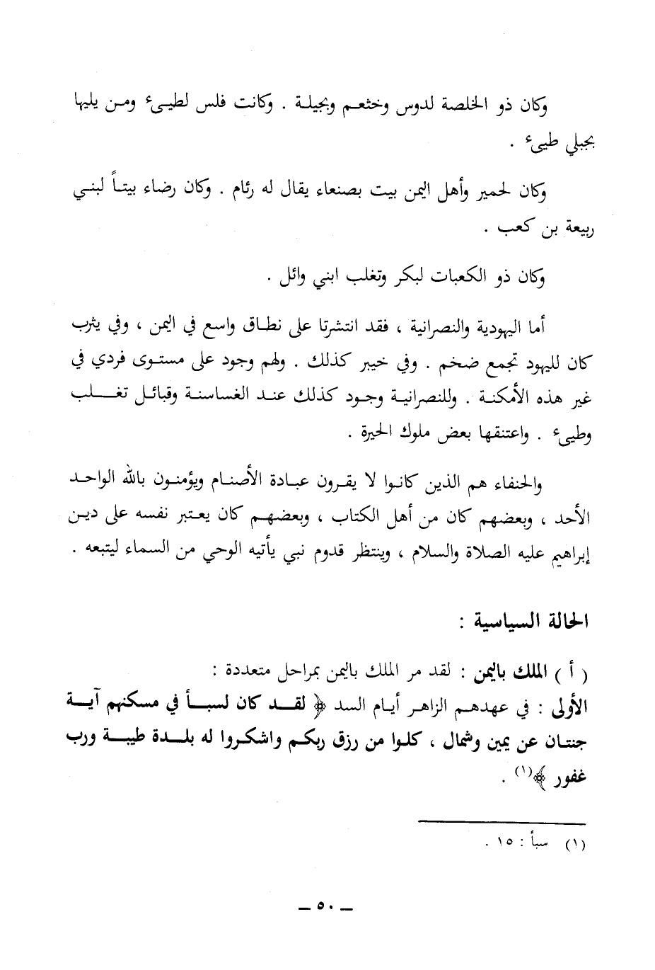 الأولى: في عهدهم الزاهر أيام السد {لقد كان لسبإ في مسكنهم آية جنتان عن يمين وشمال كلوا من رزق ربكم واشكروا له بلدة طيبة ورب غفور} (¬1).