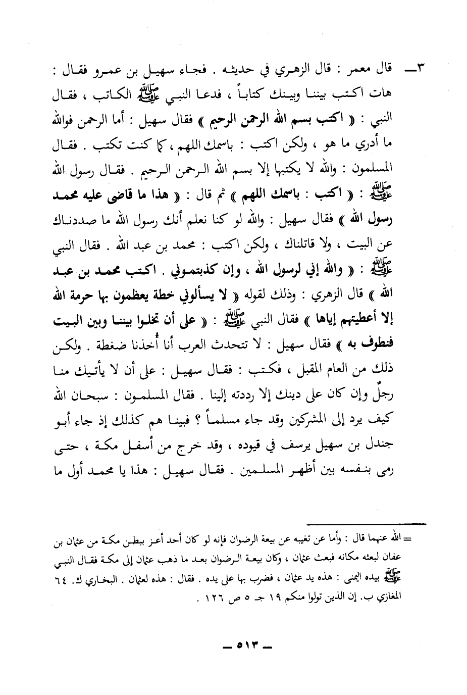 3 - قال معمر: قال الزهري في حديثه. فجاء سهيل بن عمرو فقال: هات اكتب بيننا وبينك كتابا، فدعا النبي (ص) الكتاب، فقال النبي: ((اكتب بسم الله الرحن الرحيم)) فقال سهيل: أما الرحمن فوالله ما أدري ما هو، ولكن اكتب: باسمك اللهم، كما كنت تكتب. فقال المسلمون: والله لا يكتبها إلا بسم الله الرحمن الرحيم. فقال رسول الله (ص): ((اكتب: باسمك اللهم)) ثم قال: ((هذا ما قاضى عليه محمد رسول الله)) فقال سهيل: والله لو كنا نعلم أنك رسول الله ما صددناك عن البيت، ولا قاتلناك، ولكن اكتب: محمد بن عبد الله. فقال النبي (ص) ((والله إني لرسول الله، وإن كذبتموني اكتب محمد بن عبد الله)) قال الزهري: وذلك لقوله ((لا يسألوني خطة يعظمون بها حرمة الله إلا أعطيتهم إياها)) فقال النبي (ص): ((على أن تخلوا بيننا وبين البيت فنطوف به)) فقال سهيل: لا تتحدث العرب أنا اخذنا ضغطة. ولكن ذلك من العام المقبل، فكتب: فقال سهيل: على أن لا يأتيك منا رجل وإن كان على دينك إلا رددته إلينا. فقال المسلمون: سبحان الله كيف يرد إلى المشركين وقد جاء مسلما؟ فبينا هم كذلك إذ جاء أبو