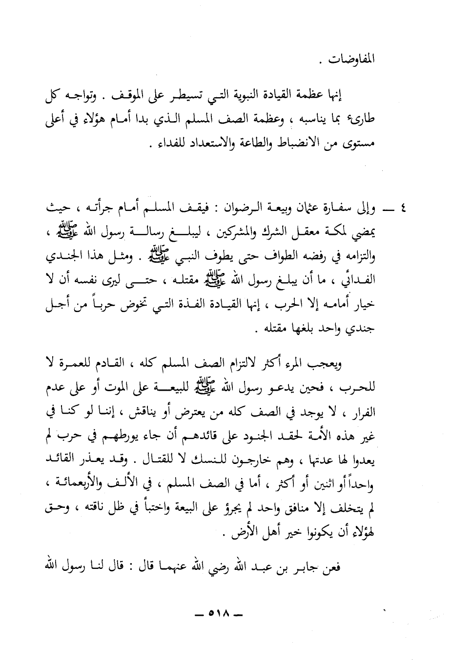 4 - وإلى سفارة عثمان وبيعة الرضوان: فيقف المسلم أمام جرأته، حيث يمضي لمكة معقل الشرك والمشركين، ليبلغ رسالة رسول الله (ص)، والتزامه في رفضه الطواف حتى يطوف النبي (ص). ومثل هذا الجندي الفدائي، ما أن يبلغ رسول الله (ص) مقتله، حتى ليرى نفسه أن لا خيار أمامه إلا الحرب، إنها القيادة الفذة التي تخوض حربا من أجل جندي واحد بلغها مقتله.