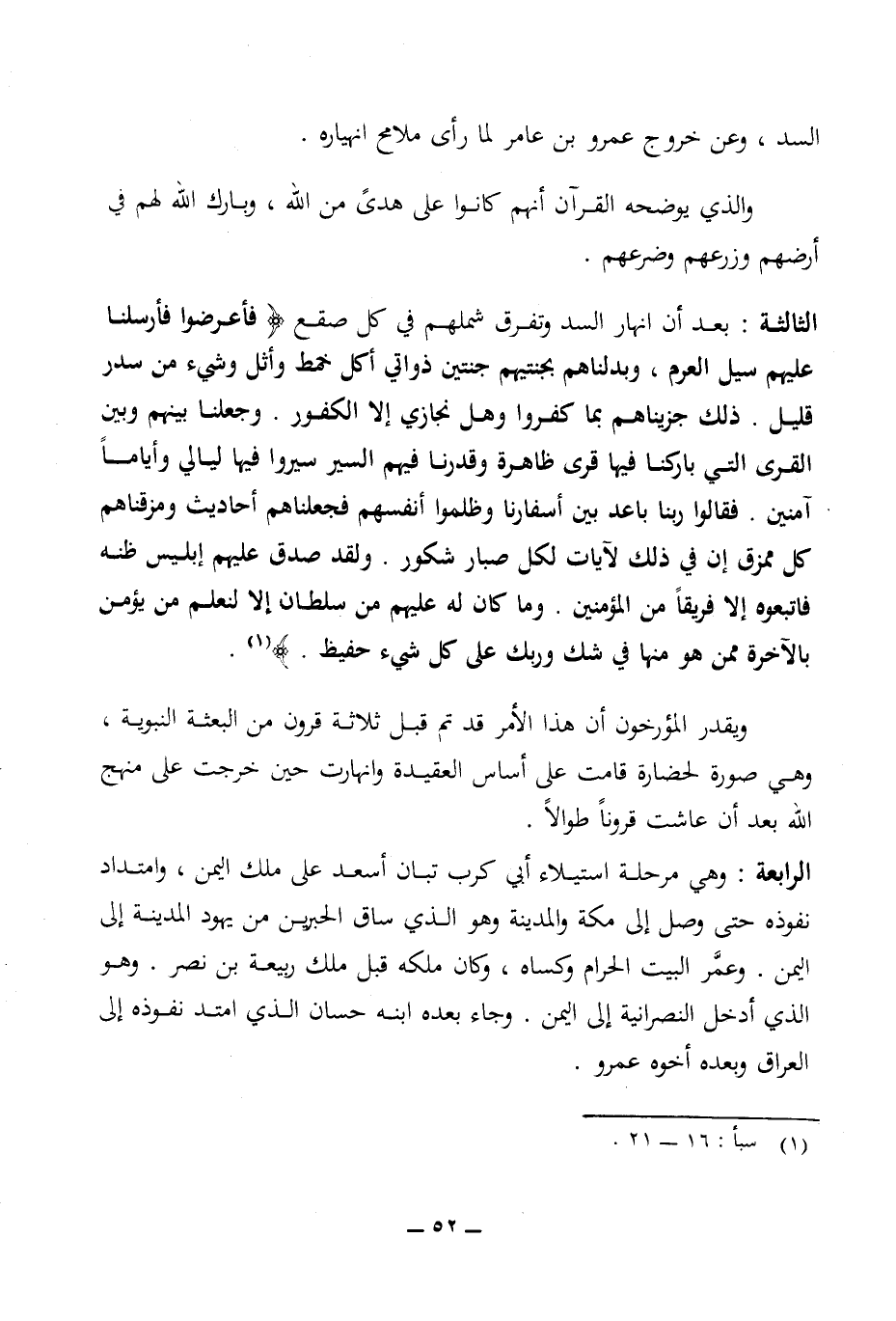 الثالثة: بعد أن انهار السد وتفرق كلهم في كل صقع {فأعرضوا فأرسلنا عليهم سيل العرم وبدلناهم بجنتيهم جنتين ذواتي أكل خمط وأثل وشيء من سدر قليل * ذلك جزيناهم بما كفروا وهل نجازي إلا الكفور * وجعلنا بينهم وبين القرى التي باركنا فيها قرى ظاهرة وقدرنا فيها السير سيروا فيها ليالي وأياما آمنين * فقالوا ربنا باعد بين أسفارنا وظلموا أنفسهم فجعلناهم أحاديث ومزقناهم كل ممزق إن في ذلك لآيات لكل صبار شكور * ولقد صدق عليهم إبليس ظنه فاتبعوه إلا فريقا من المؤمنين * وما كان له عليهم من سلطان إلا لنعلم من يؤمن بالآخرة ممن هو منها في شك وربك على كل شيء حفيظ} (¬1).