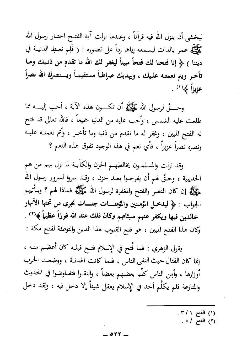 وحق لرسول الله (ص) أن تكون هذه الآية، أحب إليه مما طلعت عليه الشمس، وأحب عليه من الدنيا جميعا، فالله تعالى قد فتح له الفتح المبين، وغفر له ما تقدم من ذنبه وما تأخر، وأتم نعمته عليه ونصره نصرا عزيزا، فأي نعم في هذا الوجود تفوق هذه النعم؟ وقد نزلت والمسلمون يخالطهم الحزن والكآبة لما نزل بهم من هم الحديبية، وحق لهم أن يفرحوا بعد حزن، وقد سروا لسرور رسول الله (ص) إن كان النصر والفتح والمغفرة لرسول الله فماذا لهم؟ ويأتيهم الجواب: {ليدخل المؤمنين والمؤمنات جنات تجري من تحتها الأنهار خالدين فيها ويكفر عنهم سيئاتهم وكان ذلك عند الله فوزا عظيما} (¬2). وكان هذا الفتح المبين، هو فتح القلوب لهذا الدين والتوطئة لفتح مكة: يقول الزهري: فما فتح في الإسلام فتح قبله كان أعظم منه، إنما كان القتال حيث التقى الناس، فلما كانت الهدنة، ووضعت الحرب أوزارها، وأمن الناس كلم بعضهم بعضا، والتقوا فتفاوضوا في الحديث والمنازعة فلم يكلم أحد في الإسلام يعقل شيئا إلا دخل فيه، ولقد دخل