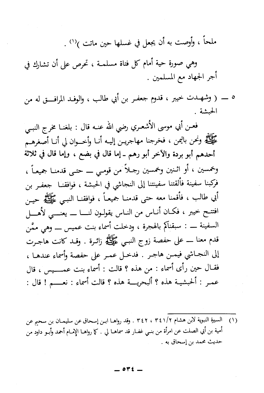 فعن أبي موسى الأشعري رضي الله عنه قال: بلغنا مخرج النبي (ص) ونحن باليمن، فخرجنا مهاجرين إليه أنا وأخوان لي أنا أصغرهم أحدهم أبو بردة والآخر أبو رهم - إما قال في بضع، وإما قال في ثلاثة وخمسين، أو اثنين وخمسين رجلا من قومي - حتى قدمنا جميعا، فركبنا سفينة فألقتنا سفينتنا إلى النجاشي في الحبشة، فوافقنا جعفر بن أبي طالب، فأقمنا معه حتى قدمنا جميعا، فوافقنا النبي (ص) حين افتتح خيبر، فكان أناس من الناس يقولون لنا - يعني لأهل السفينة -: سبقناكم بالهجرة، ودخلت أسماء بنت عميس - وهي ممن قدم معنا - على حفصة زوج النبي (ص) زائرة. وقد كانت هاجرت إلى النجاشي فيمن هاجر. فدخل عمر على حفصة وأسماء عندها، فقال حين رأى أسماء: من هذه؟ قالت: أسماء بنت عميس، قال عمر: ألحبشية هذه؟ ألبحرية هذه؟ قالت أسماء: نعم! قال: