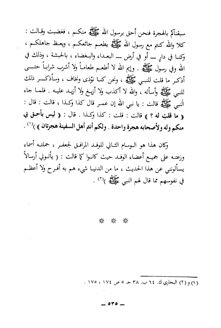 سبقناكم بالهجرة فنحن أحق برسول الله (ص) منكم، فغضبت وقالت: كلا والله كنتم مع رسول الله (ص) يطعم جائعكم، ويعظ جاهلكم، وكنا في دار - أو في أرض - البعداء والبغضاء، بالحبشة، وذلك في الله وفي رسوله (ص). وإيم الله لا أطعم طعاما ولا أشرب شرابا حتى أذكر ما قلت للنبي (ص)، ونحن كنا نؤذى ونخاف، وسأذكر ذلك للنبي (ص) وأسأله، والله لا أكذب ولا أزيغ ولا أزيد عليه. فلما جاء النبي (ص) قالت: يا نبي الله إن عمر قال كذا وكذا، قالت: قال: ((ما قلت له؟)) قالت: قلت: كذا وكذا. قال: ((ليس بأحق بي منكم وله ولأصحابه هجرة واحدة. ولكم أنتم أهل السفينة هجرتان)) (¬1).
