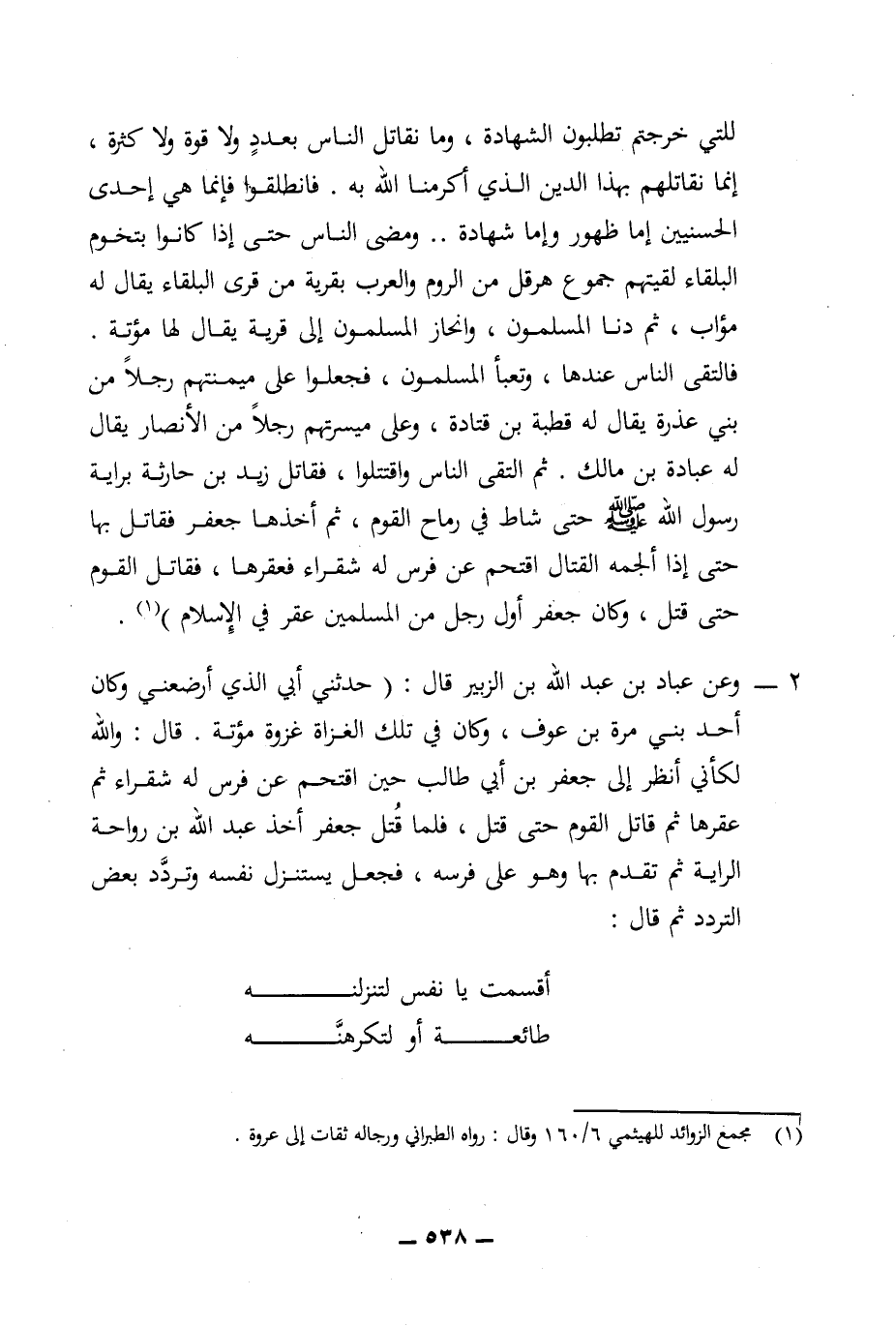2 - وعن عباد بن عبد الله بن الزبير قال: (حدثني أبي الذي أرضعني وكان أحد بني مرة بن عوف، وكان في تلك الغزاة غزوة مؤتة. قال: والله لكأني أنظر إلى جعفر بن أبي طالب حين اقتحم عن فرس له شقراء ثم عقرها ثم قاتل القوم حتى قتل، فلما قتل جعفر أخذ عبد الله بن رواحة الراية ثم تقدم بها وهو على فرسه، فجعل يستنزل نفسه وتردد بعض التردد ثم قال: