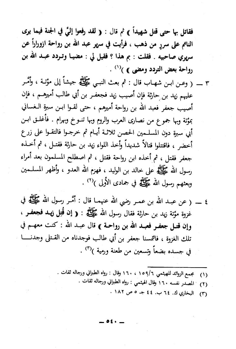 4 - (عن عبد الله بن عمر رضي الله عنهما قال: أمر رسول الله (ص) في غزوة مؤتة زيد بن حارثة فقال رسول الله (ص): ((إن قتل زيد فجعفر، وإن قتل جعفر فعبد الله بن رواحة)) قال عبد الله: كنت معهم في تلك الغزوة، فالتمسنا جعفر بن أبي طالب فوجدناه من القتلى وجدنا في جسده بضعا وتسعين من طعنة ورمية) (¬3).