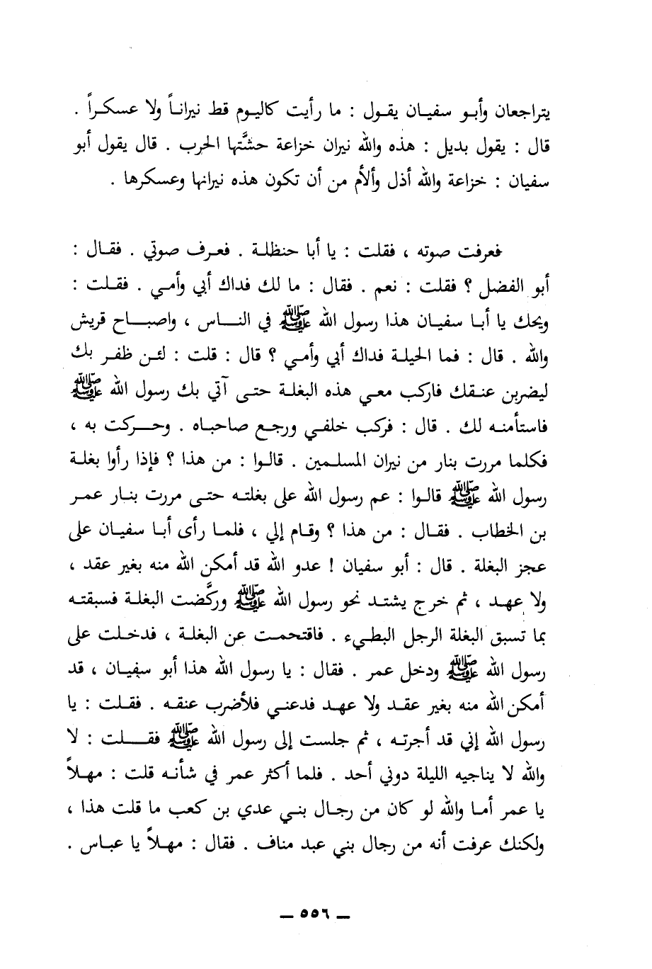 فعرفت صوته، فقلت: يا أبا حنظلة. فعرف صوتي. فقال: أبو الفضل؟ فقلت: نعم. فقال: ما لك فداك أبي وأمي. فقلت: ويحك يا أبا سفيان هذا رسول الله (ص) في الناس، واصباح قريش والله. قال: فما الحيلة فداك أبي وأمي؟ قال: قلت: لئن ظفر بك ليضربن عنقك فاركب معي هذه البغلة حتى آتي بك رسول الله (ص) فاستأمنه لك. قال: فركب خلفي ورجع صاحباه. وحركت به، فكلما مررت بنار من نيران المسلمين. قالوا: من هذا؟ فإذا رأوا بغلة رسول الله (ص) قالوا: عم رسول الله على بغلته حتى مررت بنار عمر بن الخطاب. فقال: من هذا؟ وقام إلي، فلما رأى أبا سفيان على عجز البغلة. قال: أبو سفيان! عدو الله قد أمكن الله منه بغير عقد، ولا عهد، ثم خرج يشتد نحو رسول الله (ص) وركضت البغلة فسبقته بما تسبق البغلة الرجل البطيء. فاقتحمت عن البغلة، فدخلت على رسول الله (ص) ودخل عمر 0 فقال: يا رسول الله هذا أبو سفيان، قد أمكن الله منه بغير عقد ولا عهد فدعني فلأضرب عنقه. فقلت: يا رسول الله إني قد أجرته، ثم جلست إلى رسول الله (ص) فقلت: لا والله لا يناجيه الليلة دوني أحد. فلما أكثر عمر في شأنه قلت: مهلا يا عمر أما والله لو كان من رجال بني عدي بن كعب ما قلت هذا، ولكنك عرفت أنه من رجال بني عبد مناف. فقال: مهلا يا عباس.