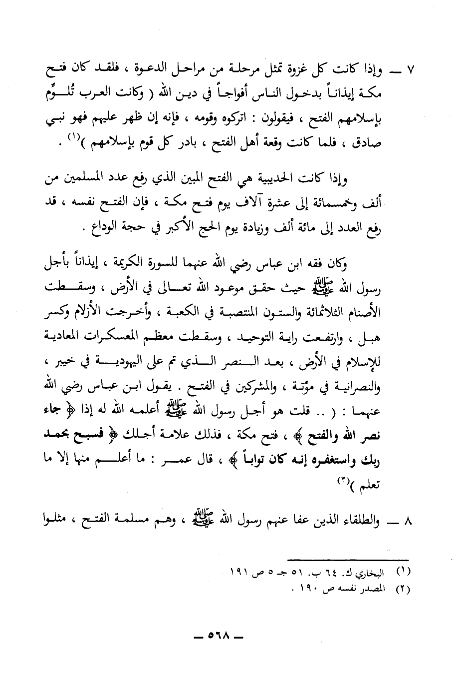 7 - وإذا كانت كل غزوة تمثل مرحلة من مراحل الدعوة، فلقد كان فتح مكة إيذانا بدخول الناس أفواجا في دين الله (وكانت العرب تلوم بإسلامهم الفتح، فيقولون: اتركوه وقومه، فإنه إن ظهر عليهم فهو نبي صادق، فلما كانت وقعة أهل الفتح، بادر كل قوم بإسلامهم) (¬1).