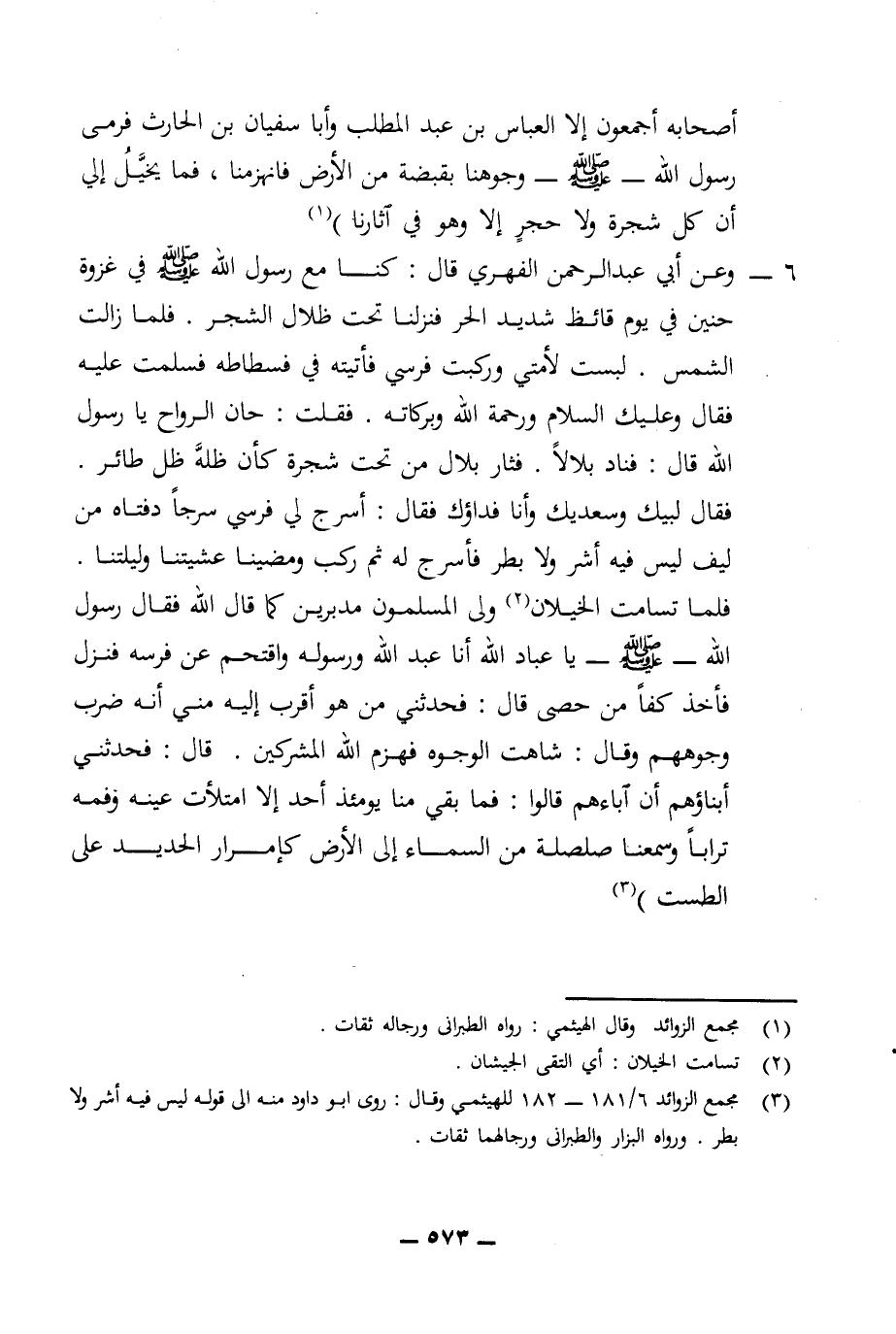 6 - وعن أبي عبد الرحمن الفهري قال: كنا مع رسول الله (ص) في غزوة حنين في يوم قائظ شديد الحر فنزلنا تحت ظلال الشجر. فلما زالت الشمس. لبست لأمتي وركبت فرسي فأتيته في فسطاطه فسلمت عليه فقال وعليك السلام ورحمة الله وبركاته. فقلت: حان الرواح يا رسول الله قال: فناد بلالا. فثار بلال من تحت شجرة كأن ظله ظل طائر.
