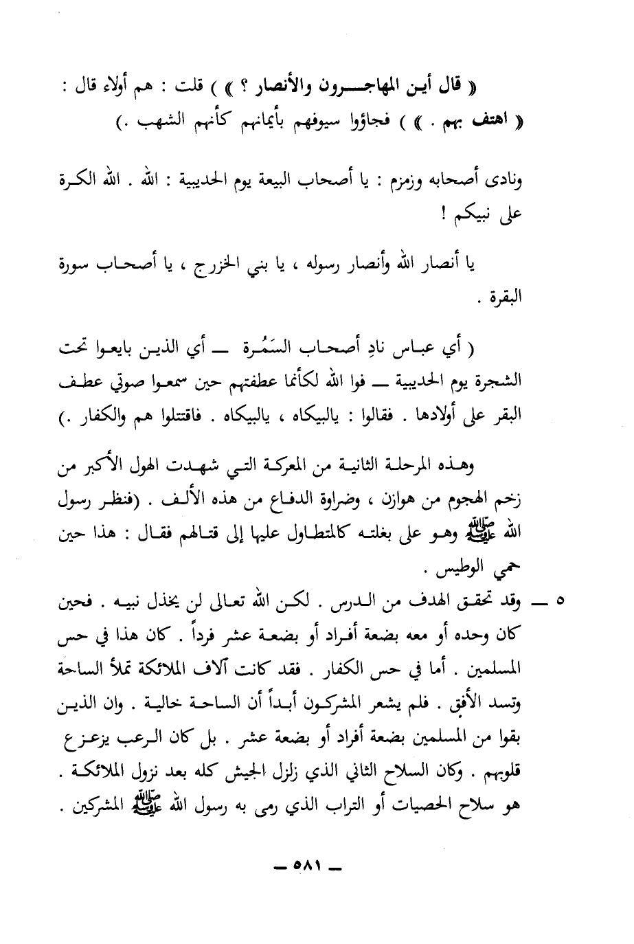 ((قال أين المهاجرون. والأنصار؟)) قلت: هم أولاء قال: ((اهتف بهم.))) فجاؤوا سيوفهم بأيمانهم كأنهم الشهب.)