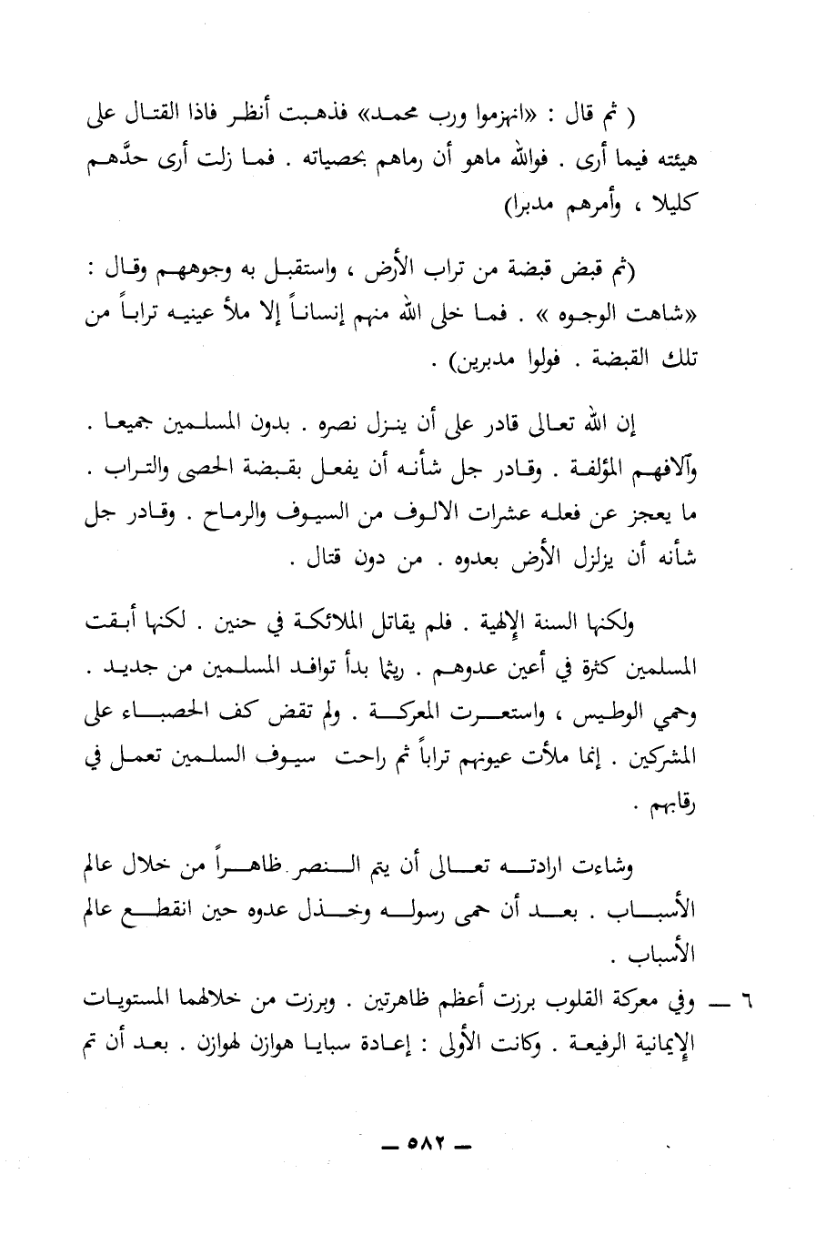 إن الله تعالى قادر على أن ينزل نصره. بدون المسلمين جميعا. وآلافهم المؤلفة. وقادر جل شأنه أن يفعل بقبضة الحصى والتراب. ما يعجز عن فعله عشرات الألوف من السيوف والرماح. وقادر جل شأنه أن يزلزل الأرض بعدوه. من دون قتال.